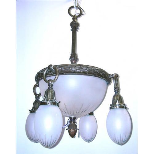 Early French bronze Neo-Classical chandelier with original satin crystal cut shades. Completely rewired. Matching chain and canopy included.Standing 25 inches H and 25 inches wide.