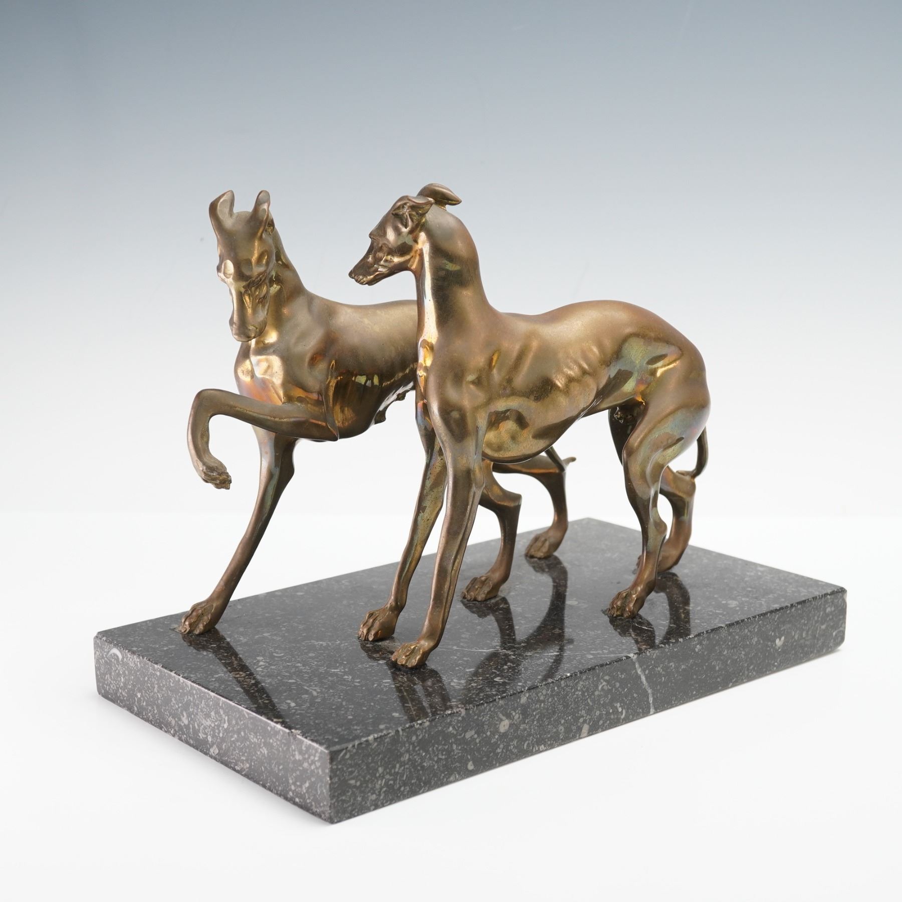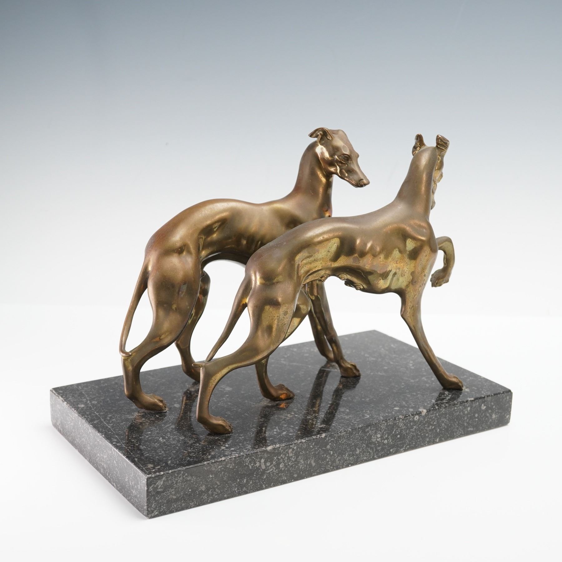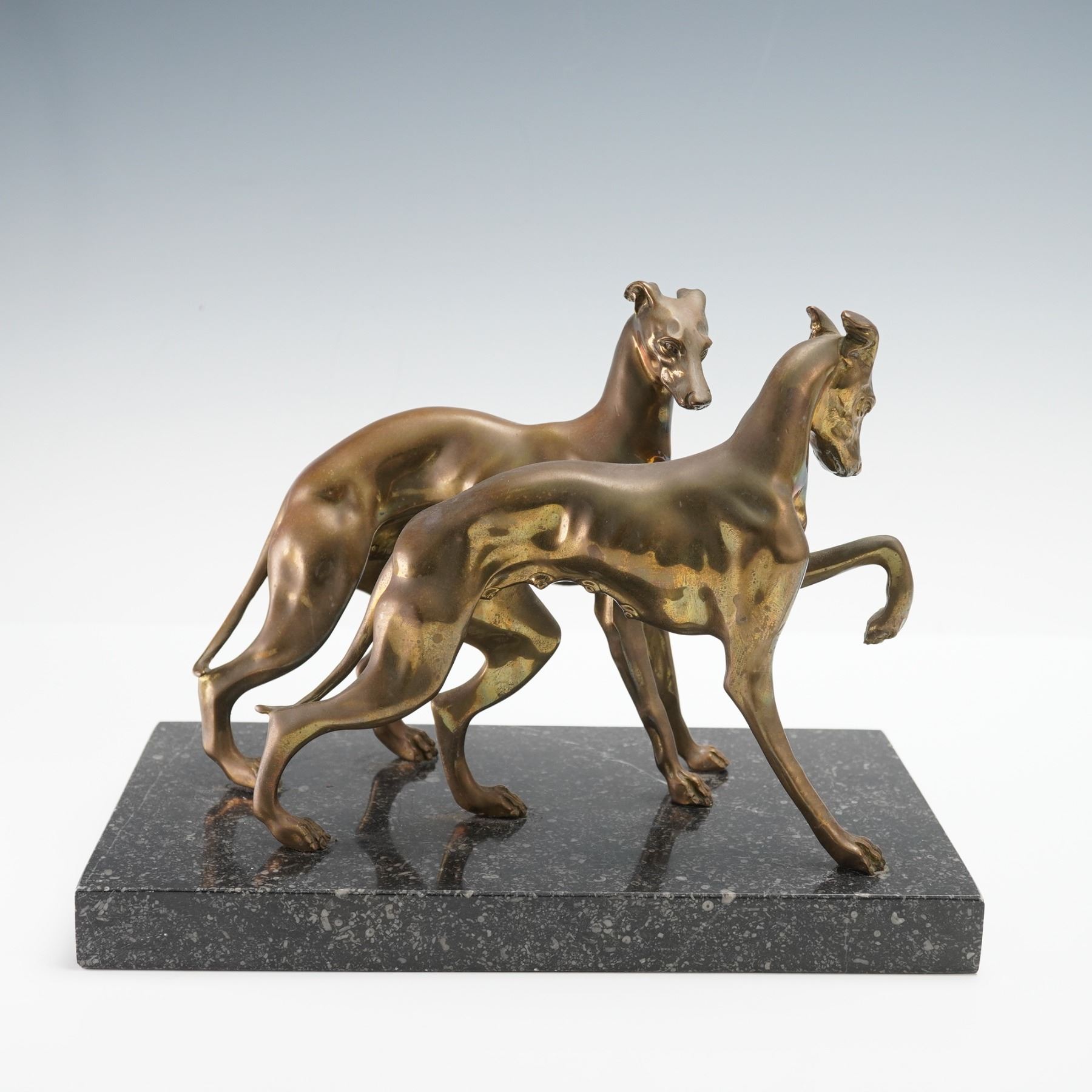 Elegant bronze sculpture depicting two greyhounds in motion, mounted on a polished black marble base. The sleek, streamlined forms capture the graceful musculature and poised stance of the dogs, emphasizing their agility and refined symmetry. The warm bronze patina lends depth and dimension to the sculptural surfaces, contrasting beautifully against the cool marble platform. A striking decorative piece evocative of Art Deco influence and classic canine form.