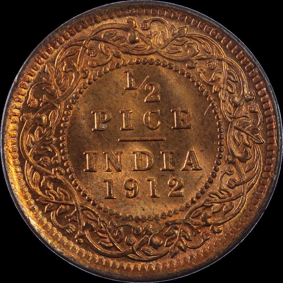 1912,King George V,Bronze 1/2 Pice,Calcutta Mint,(PR # 745),Red UNC,Scarce.