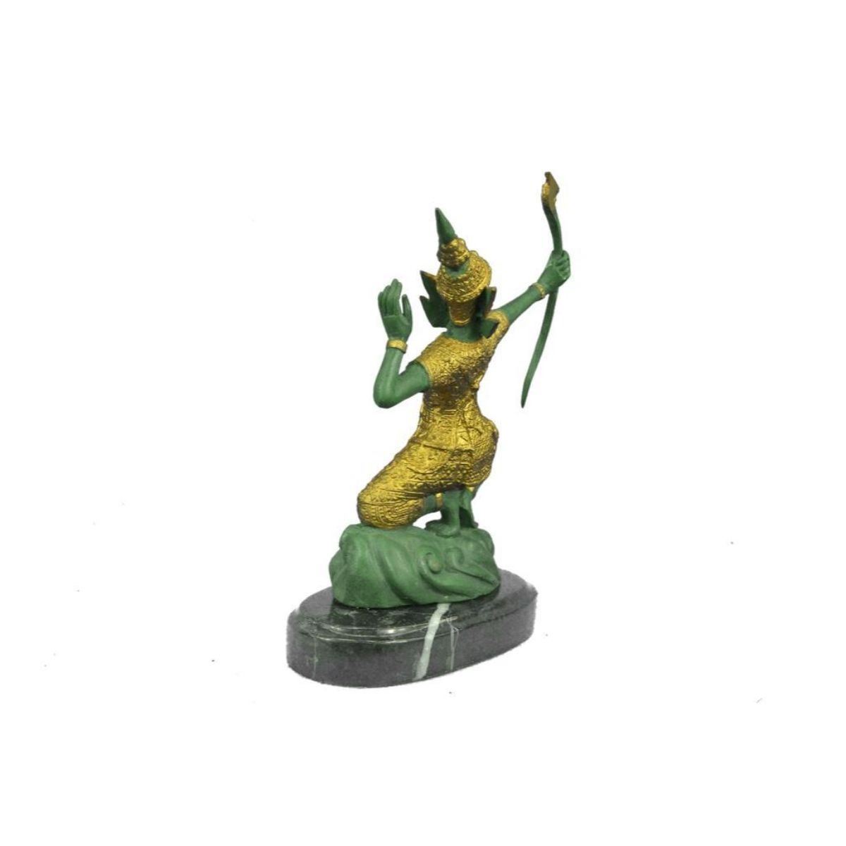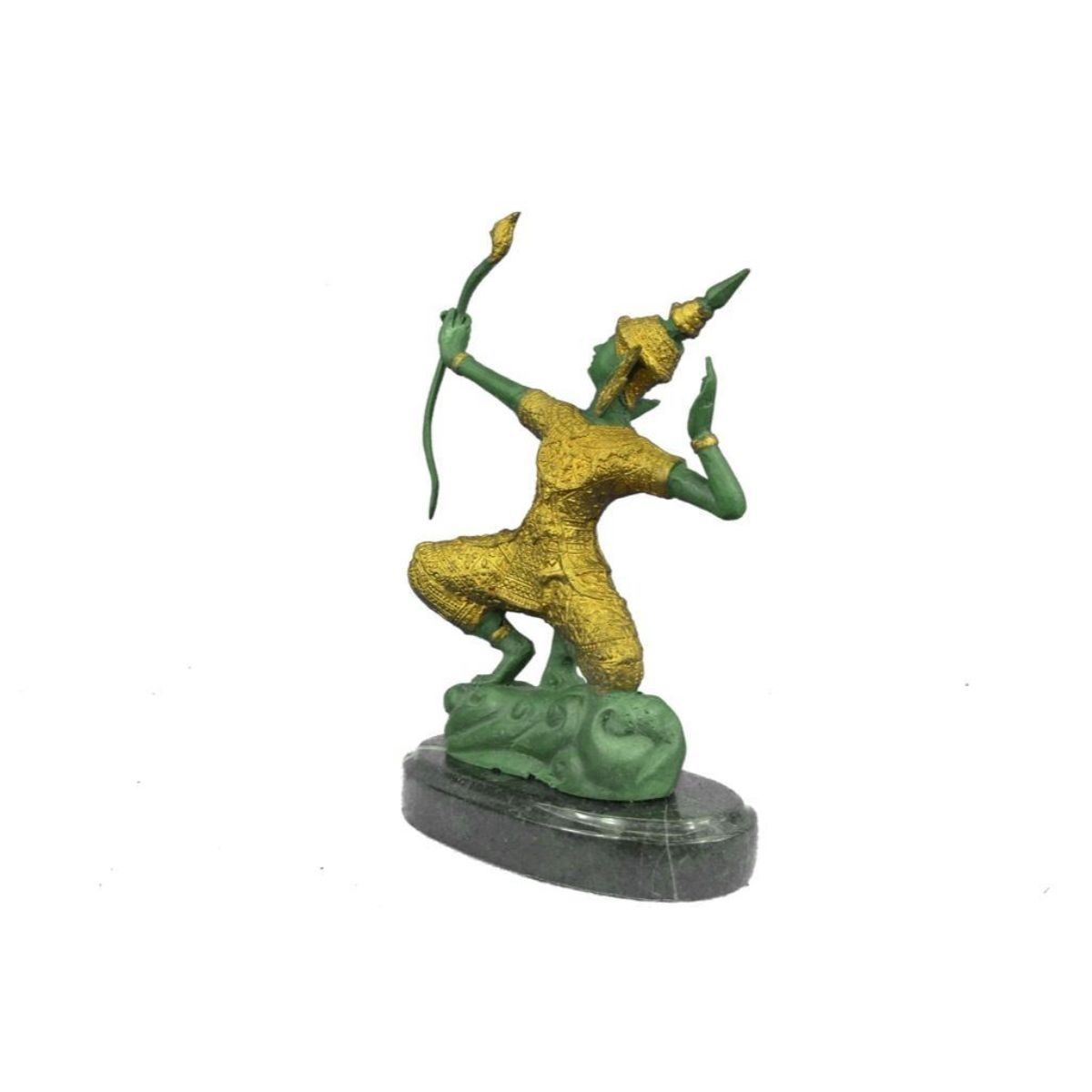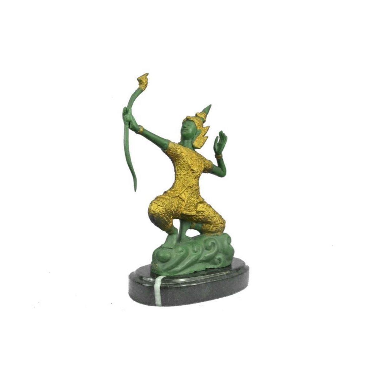 Hindu Prince Rama the protector, lost wax casting bronze shrine sculpture, with lovely green & gilt patina, mounted on marble base. Signed by artist Ming. 10" H X 7" W. 5lbs weight. Lord Rama, one of the most popular gods in the Hindu religion, is holds a bow and arrow indicating his readiness to destroy evils. Also known as “Shri Ramaâ€.