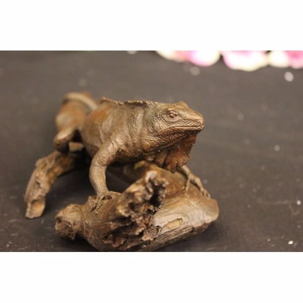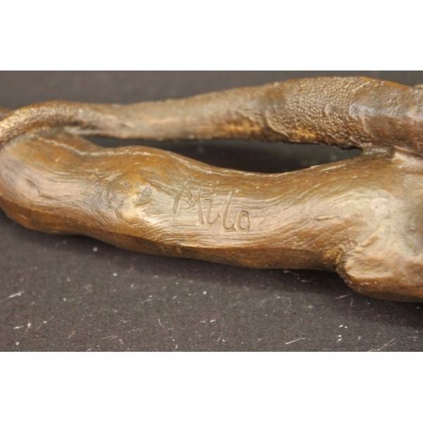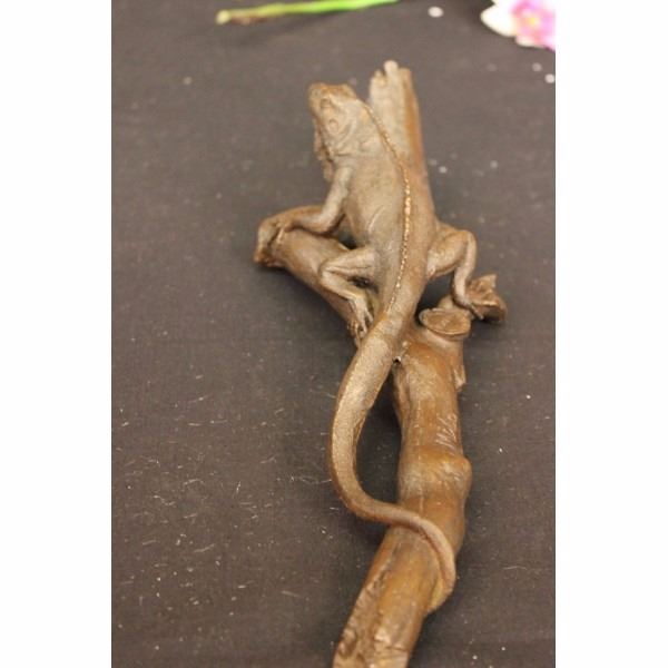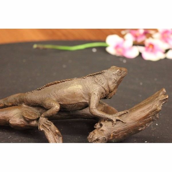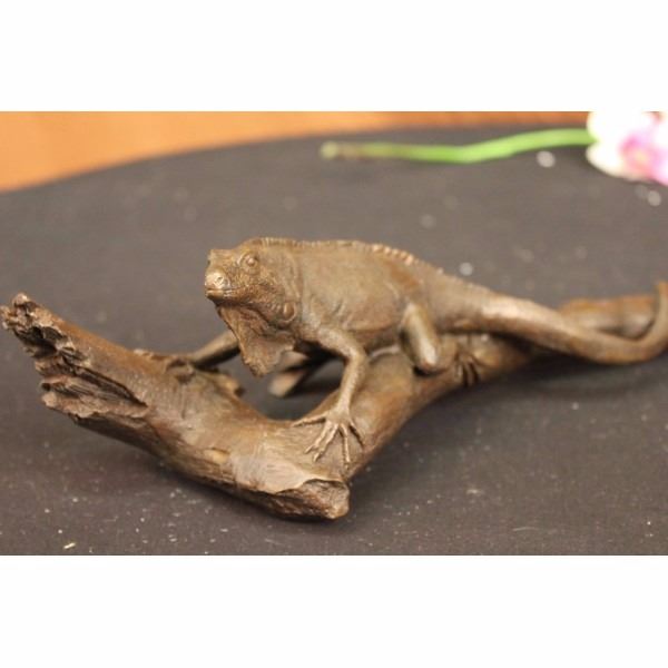 This is an exquisitely representational sculpture of an iguana. It's lifelike quality is impressive as the beholder can truly imagine it on a branch of a dripping tree in the tropics. The contemplative creature expresses infinite acceptance and contentment and is revered for its symbolic meaning of contentment, awareness, confidence, expectation, contemplation and appreciation. The handmade bronze sculpture was cast using the age-old method of lost-wax casting and stained with a brown patina finish for preservation. It is mounted upon a black marble base with the artist Milo's signature.The artist Milo lived most of his childhood in Andalusia, Spain. Influenced by an artistic family background, he began sculpting at the age of seventeen. After apprenticing with several accomplished sculptors both in America and Spain, he began his own work focusing equally on steel and bronze. Condition: This sculpture is in perfect condition. Bronze Dimensions :Height 4" x Width 13" Weight :6 LBS Inventory : 45X20252654