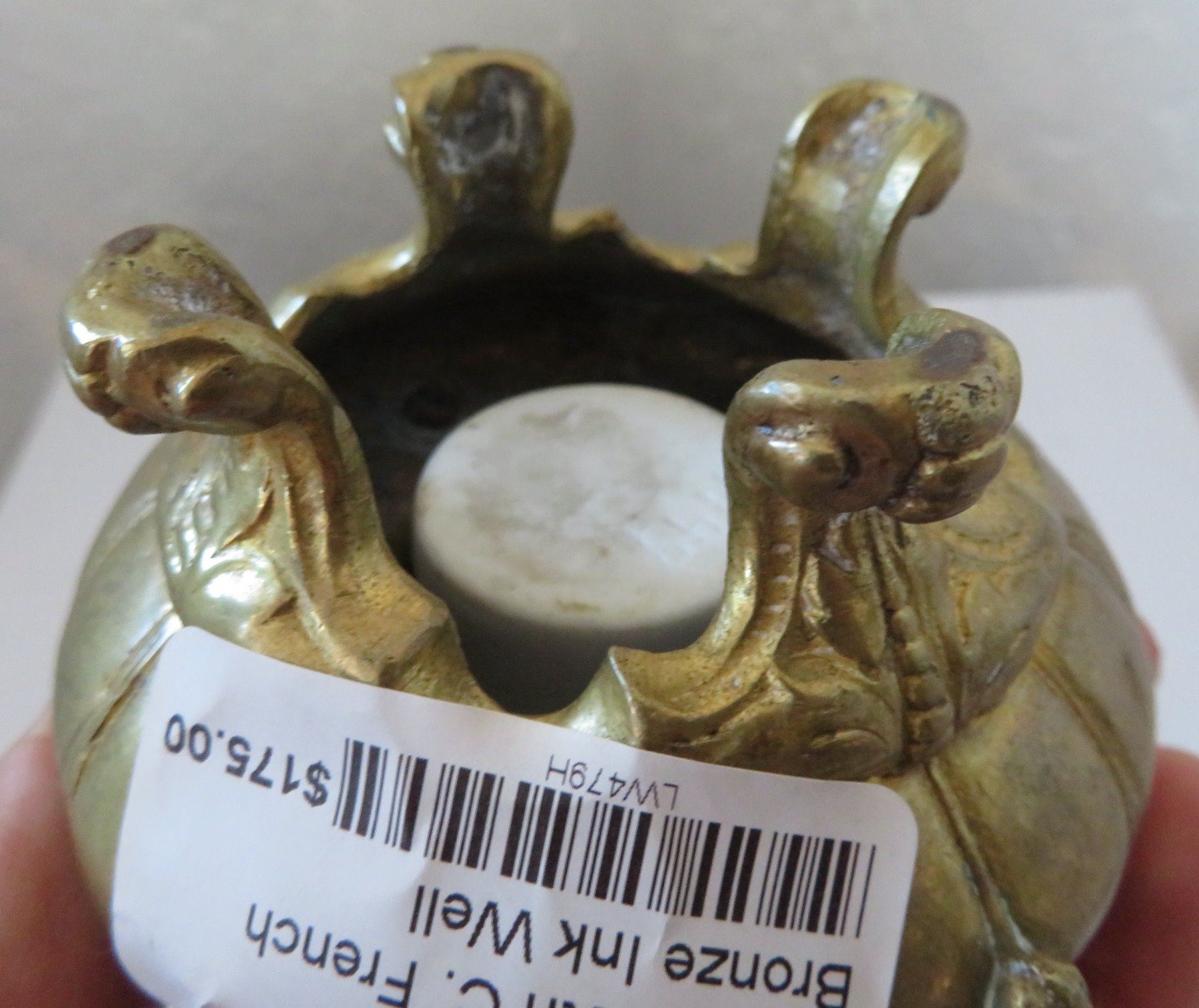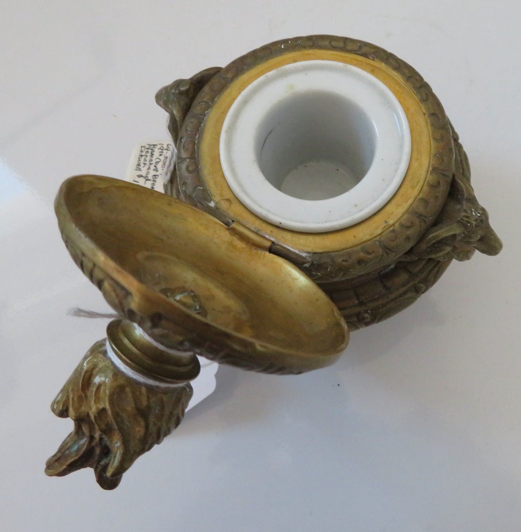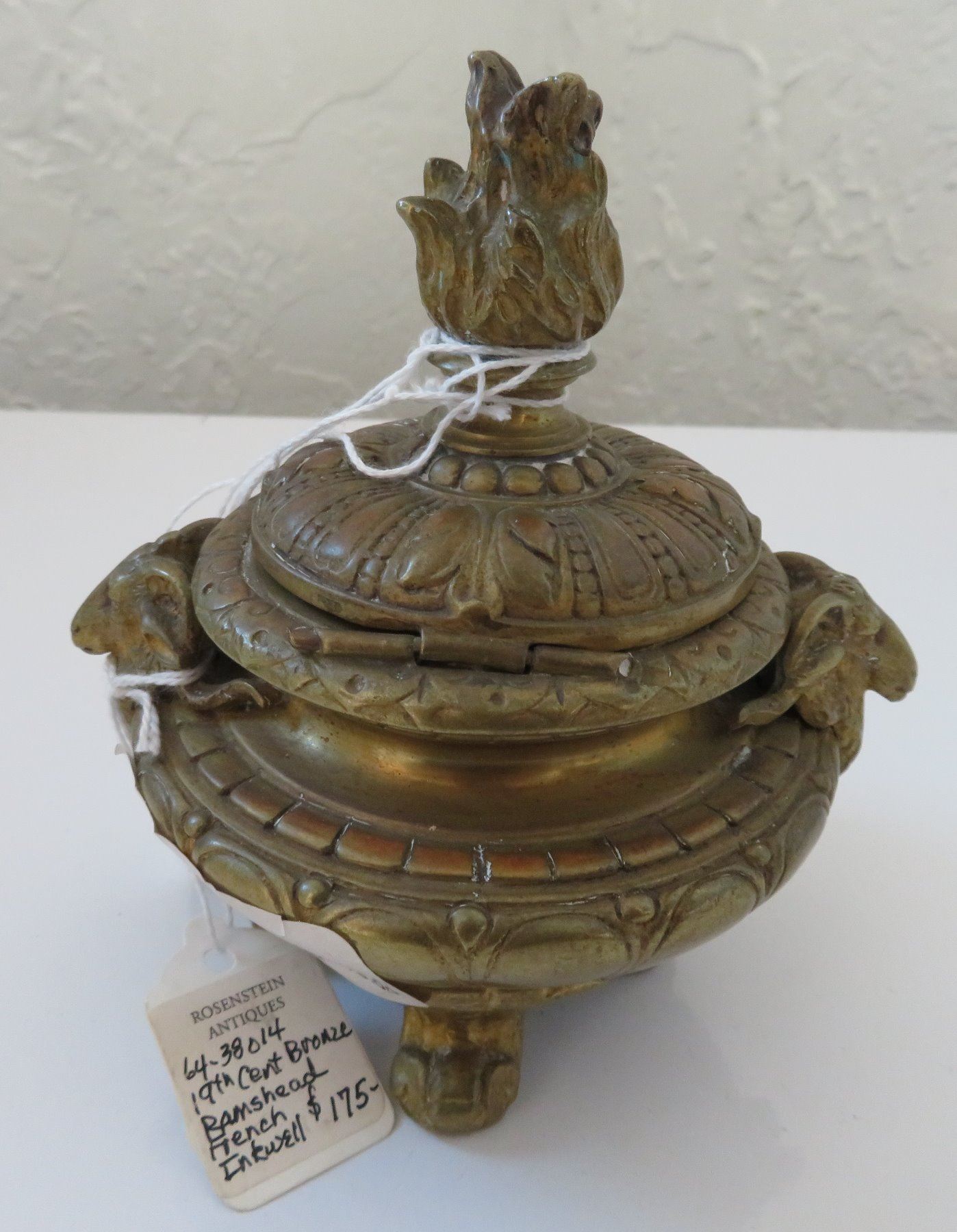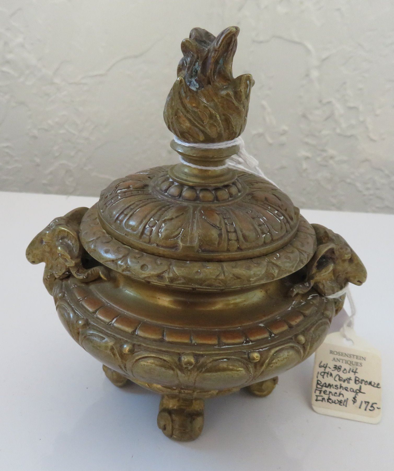 Bronze Ink Well w/Rams, 19th century item. Made of bronze and ceramic bowl, the item measures 5" x 6". French. Ramshead adorn the bronze ink well. Condition: Good, patina, see images. Shipping: $22.50 w/insurance and signature.