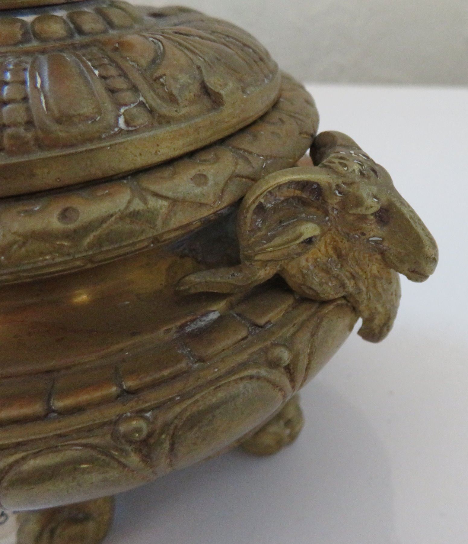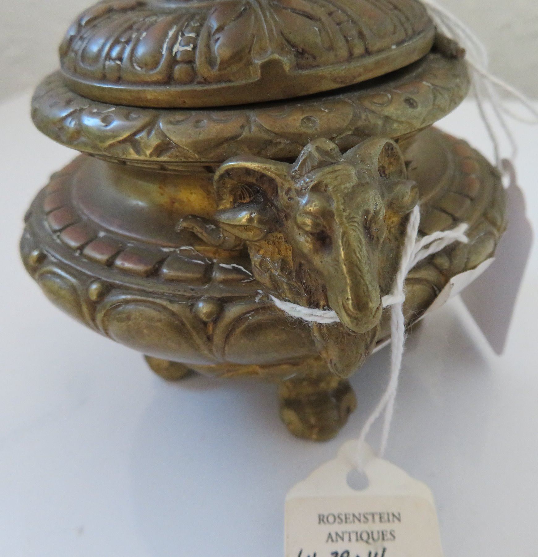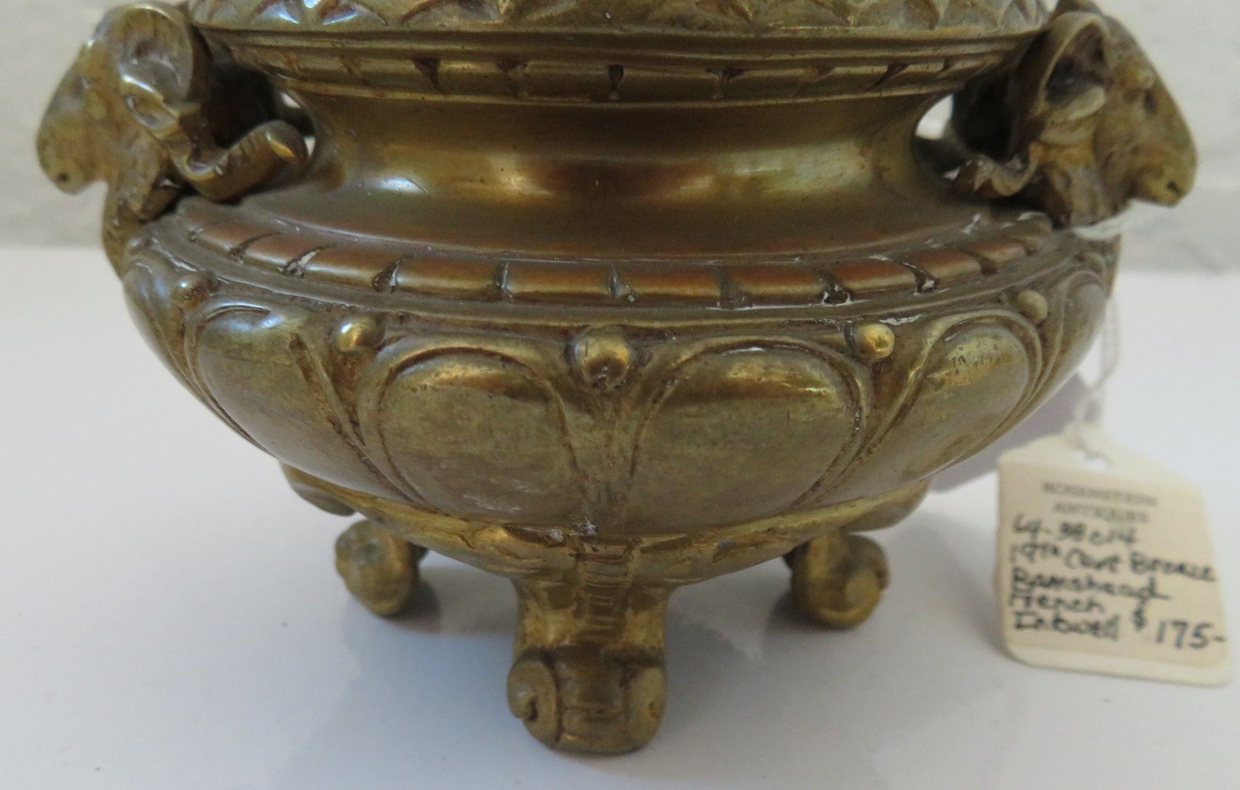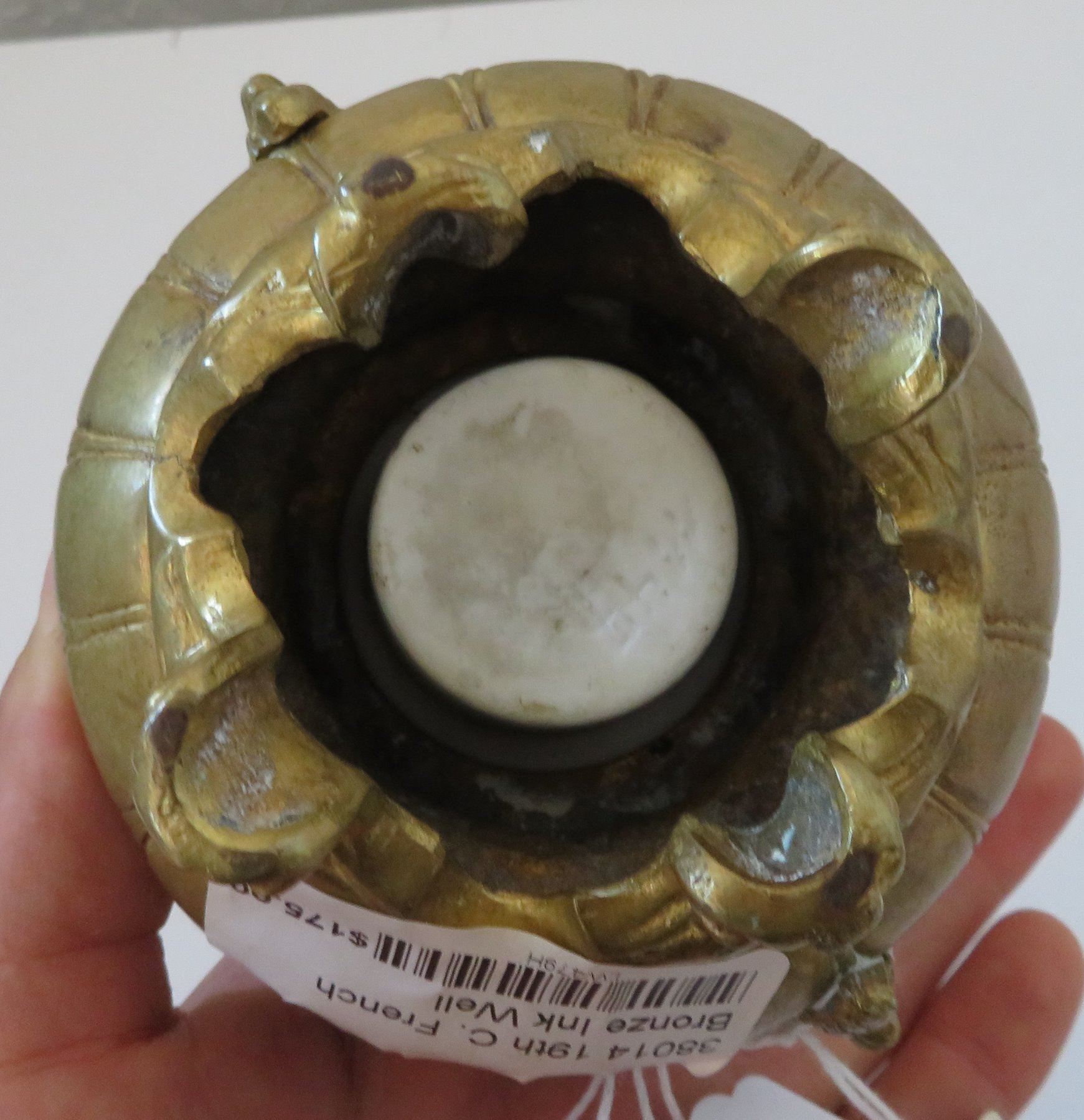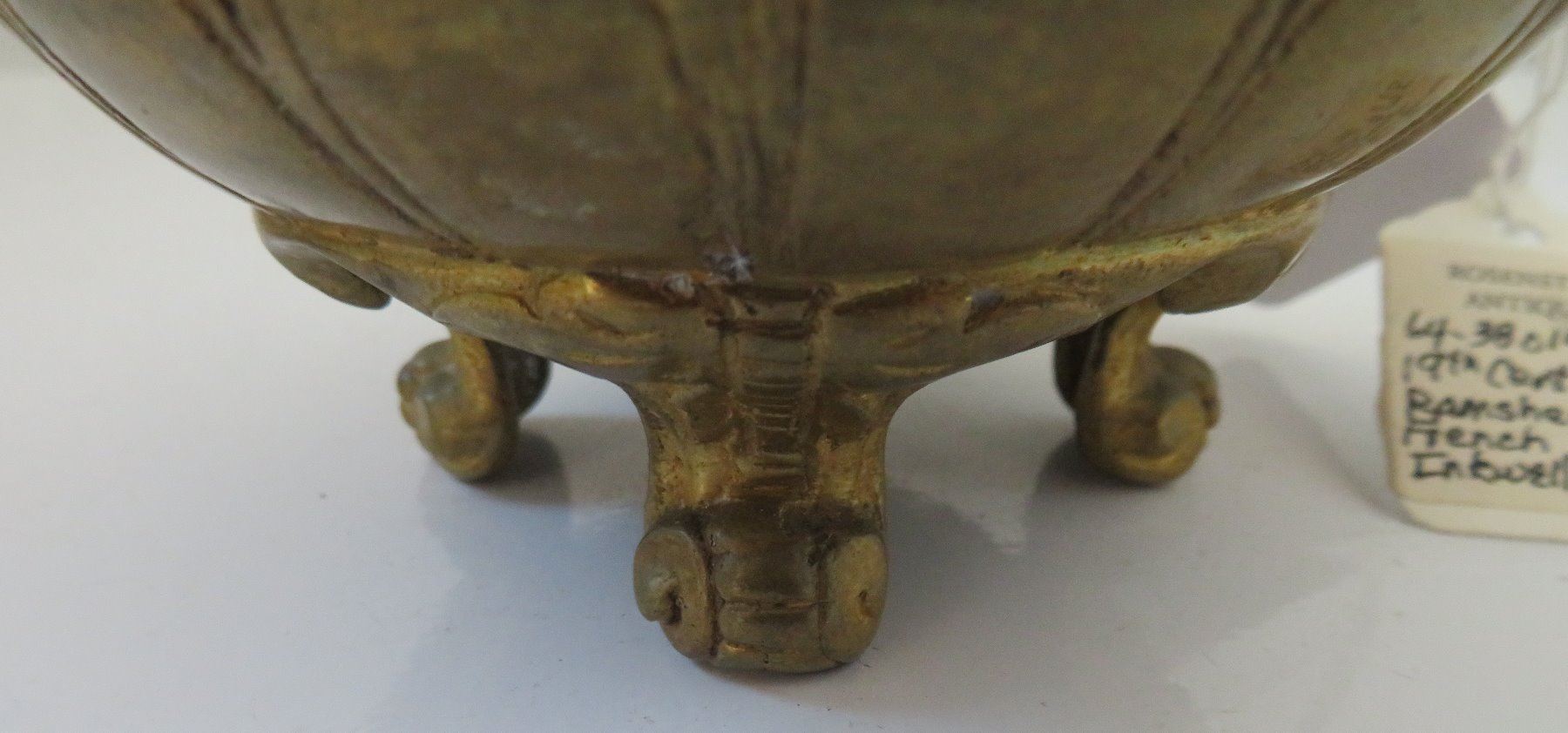 Bronze Ink Well w/Rams, 19th century item. Made of bronze and ceramic bowl, the item measures 5" x 6". French. Ramshead adorn the bronze ink well. Condition: Good, patina, see images. Shipping: $22.50 w/insurance and signature.