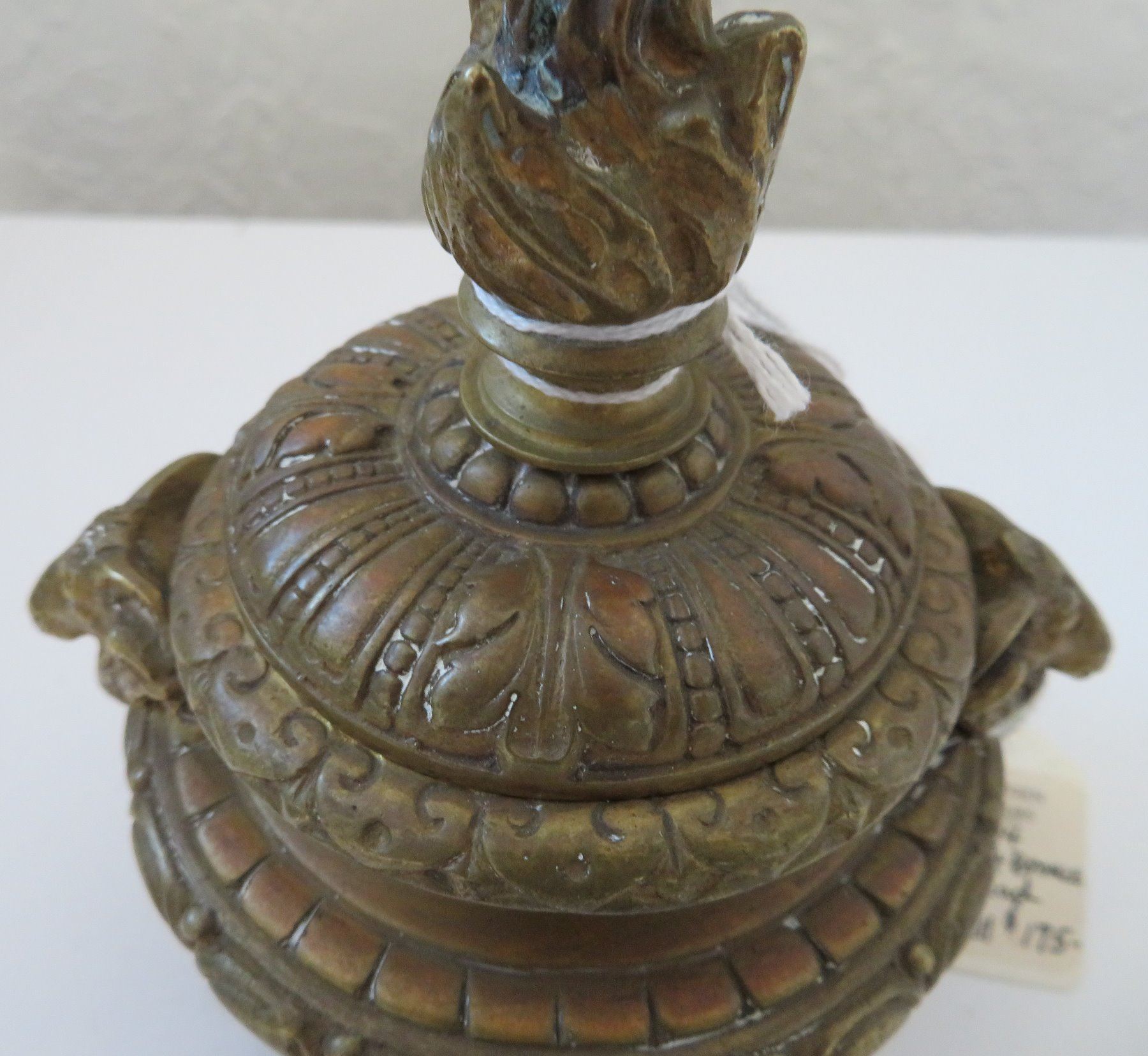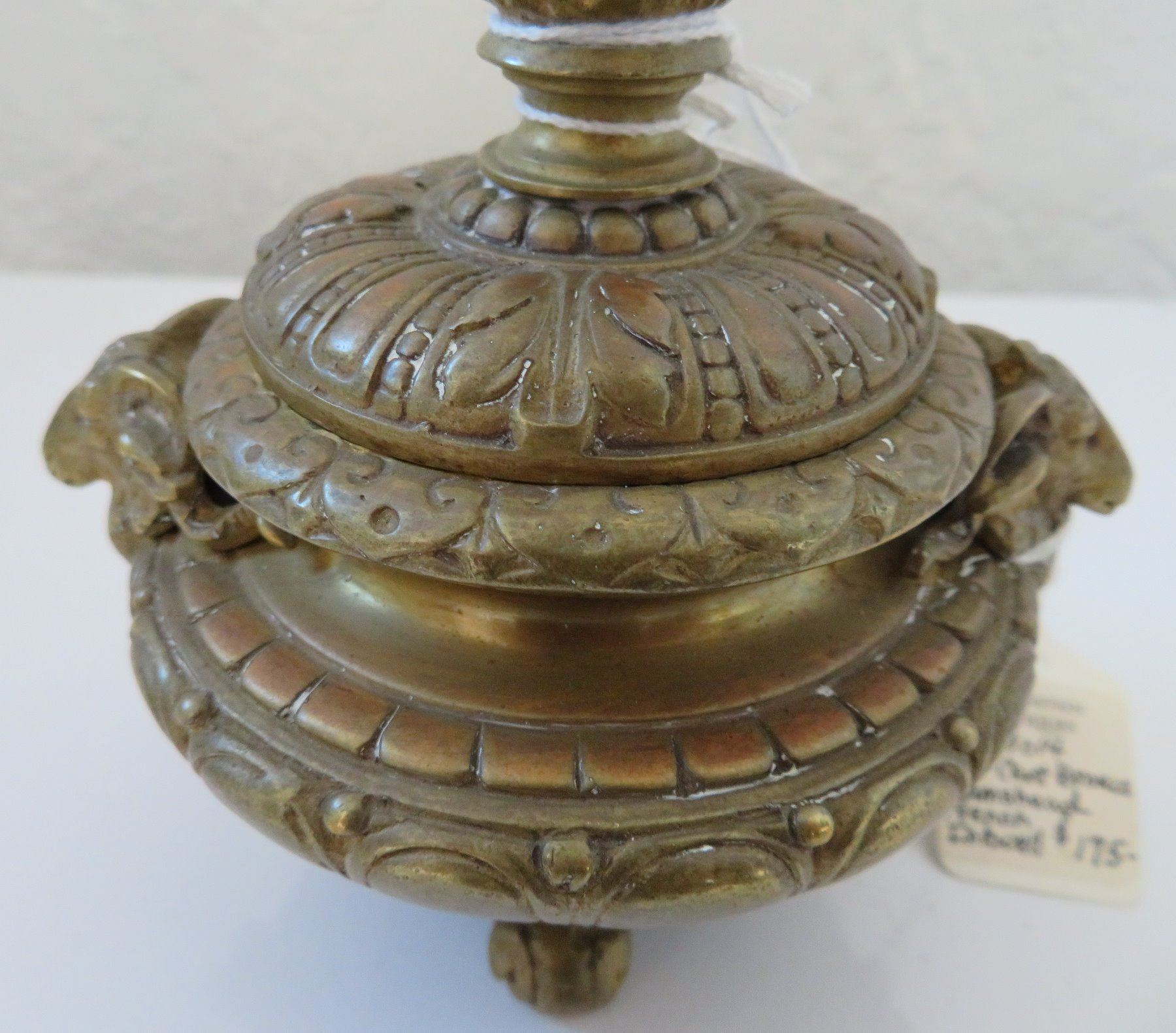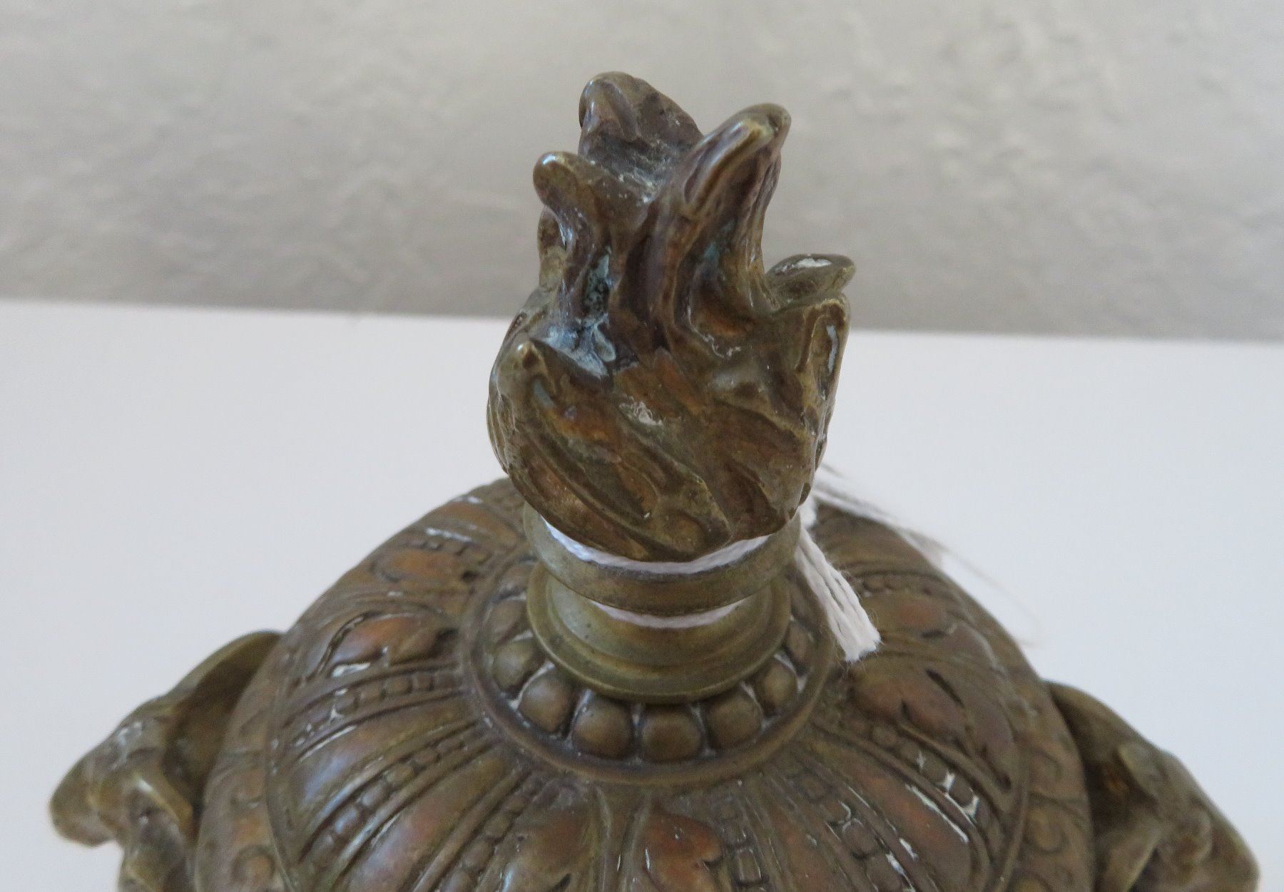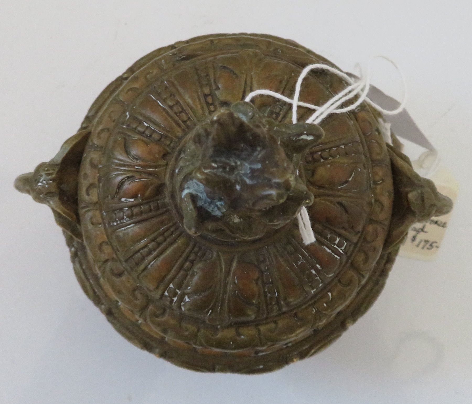 Bronze Ink Well w/Rams, 19th century item. Made of bronze and ceramic bowl, the item measures 5" x 6". French. Ramshead adorn the bronze ink well. Condition: Good, patina, see images. Shipping: $22.50 w/insurance and signature.