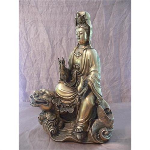 Stunning, powerful bronze Guan Yin rides foo dog/fish.</em></td>