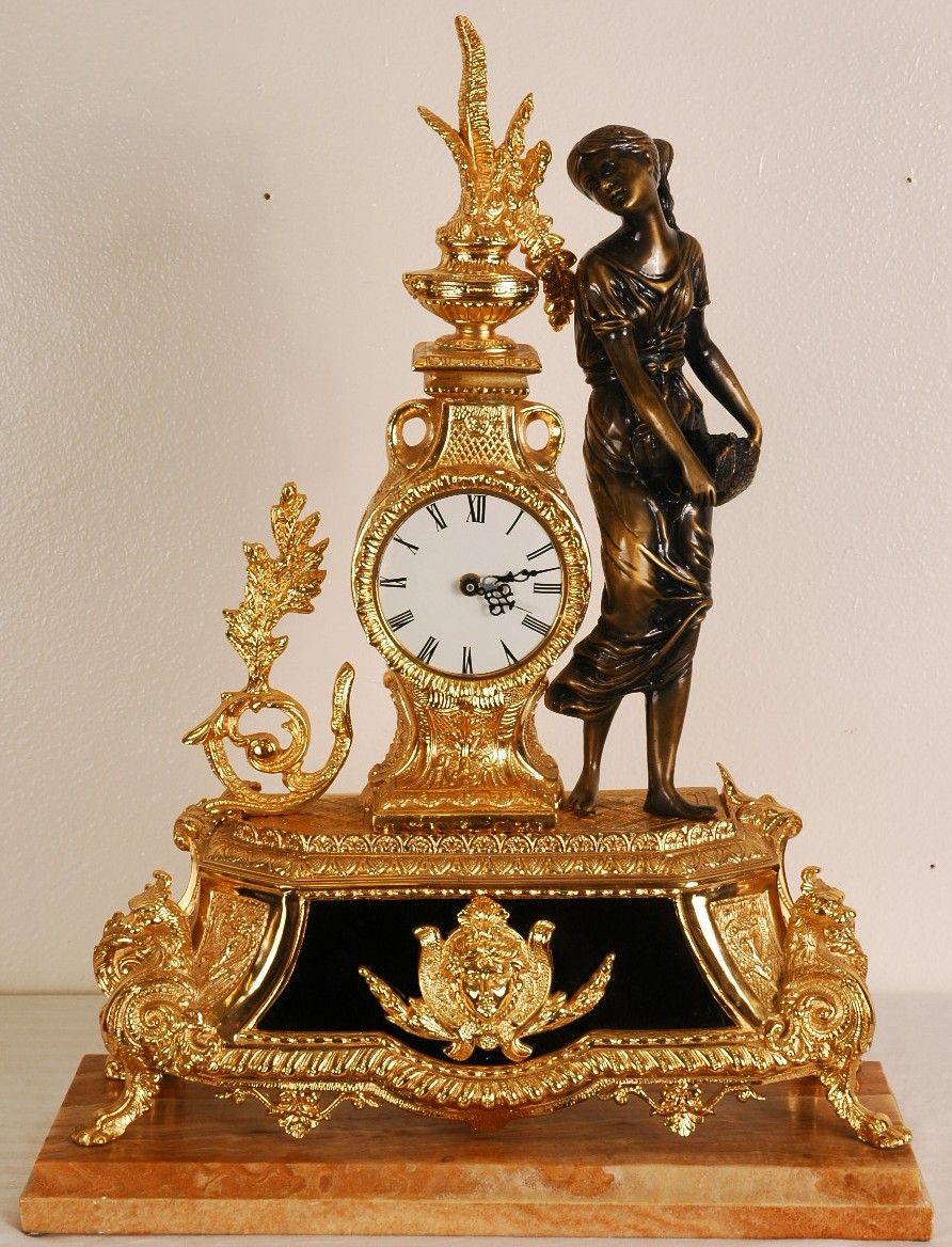 Bronze lady holding a basket standing, leaning against gold leaf, metal and bronze clock on large ornate bronze and marble base. Two bronze dragonheads adorn two of the four corners of the base. 23" H x 17"W x 7.5" D