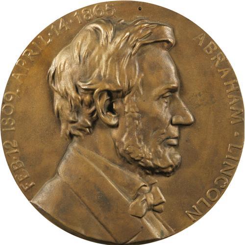 <B>Bronze Lincoln in Profile Memorial Plaque.</B></I> This sturdy wall-hanging has a diameter of 9.75". Raised lettering around the border of the plaque reads "Feb. 12 1809. April 14 1865 Abraham Lincoln". No artist or maker's mark. Hole drilled at top for nail hanging. The plaque is in fine condition, with no noticeable wear or discoloration present. A real treat for any Lincoln collector.<BR><BR><b>Shipping:</b> Miscellaneous Collectibles, Larg (<a target="_blank" href="http://www.heritageauctions.com/common/shipping.php">view shipping information</a>)