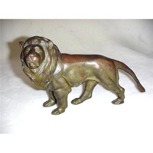 Bronze figure of a Lion. 9 1/2" long x 6" tall. Some discoloration to metal because of age. Probably mounted on a base, now missing.