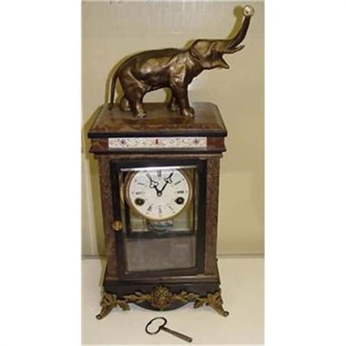 Nice working mantle clock with a mounted, bronze elephant mounted, marble case, raised on bronze feet, enamel dial, trim and pendulum, charms on the half hour and on the hour. Key included.