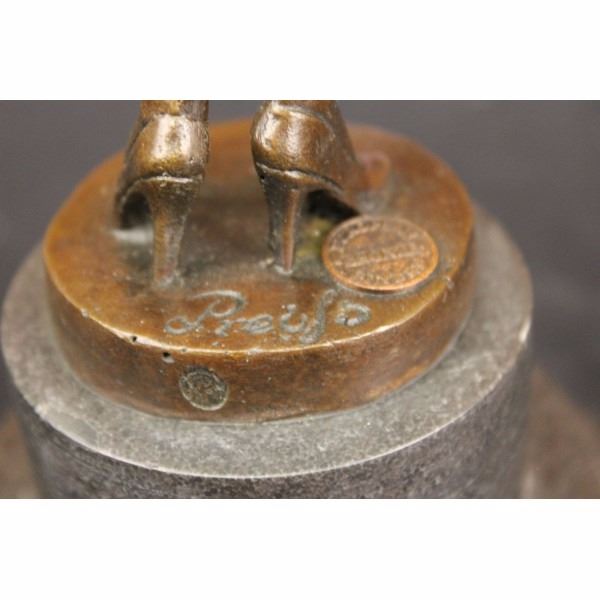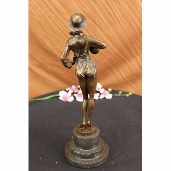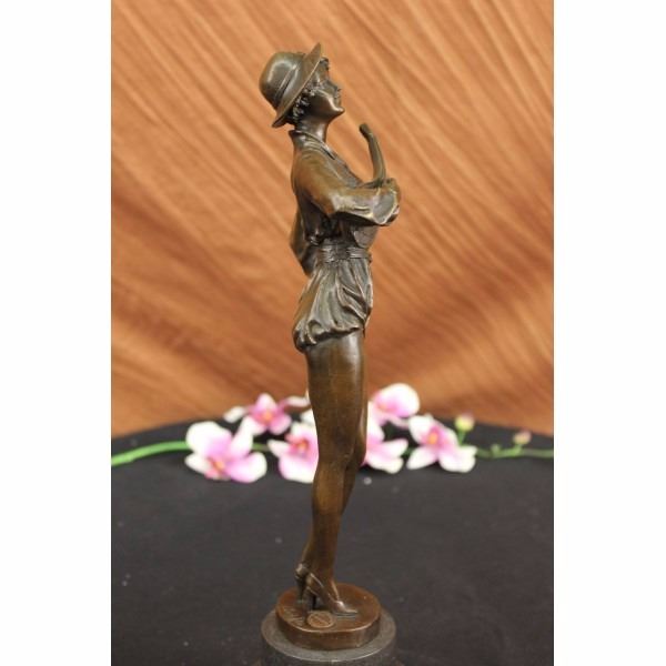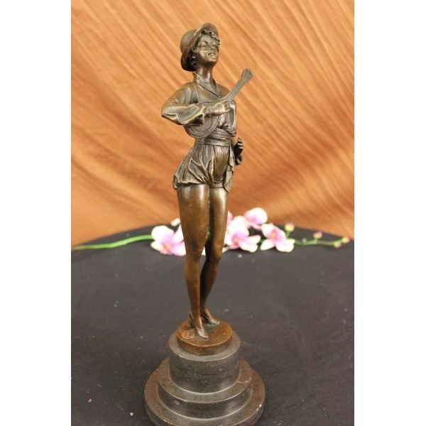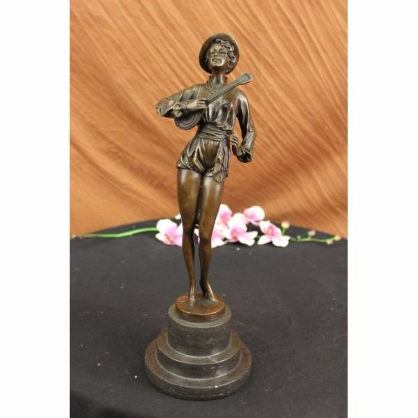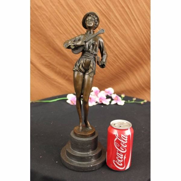 She stands center stage with her hand perched high on her hip and tucks her guitar under the crook of her arm. She tilts her head up slightly with pride. She is dressed in thigh high shorts, a loose fitting blouse that is belted with a sash around her curvy waist and high heels. A hat sits slanted on her short curly head. 100% bronze and handmade, this brown patina sculpture was cast using the "Lost Wax Method" and mounted on a marble base and is signed by artist Milo. Condition : This sculpture is in very Good condition. Bronze Dimensions with Marble Base:Height 15 1/2" x Width 5" Marble Dimensions: Diameter 5" Height without base: 12 1/2" Weight : 9 LBS Inventory : 31-B700451 3