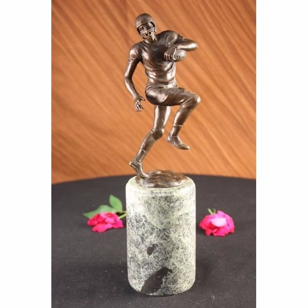 A muscular football player runs for the end field, trying to skip the yards and avoid being tackled. His powerful legs ache as he sprints and dodges. He tucks the ball under his arm protectively. Every once in a while he glances over his shoulder to see how close his opponents are. He eyes the white touch down line. 100% bronze and handmade, this brown patina sculpture was cast using the "Lost Wax Method" and mounted on a marble base. This sculpture is in very good condition. Bronze Dimensions with Marble Base:Height 12" x Width 4" Marble Dimensions: Diameter 3" Height without base: 7" Weight : 7 LBS Inventory; 68-B7122386