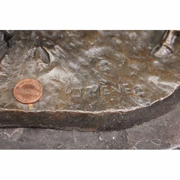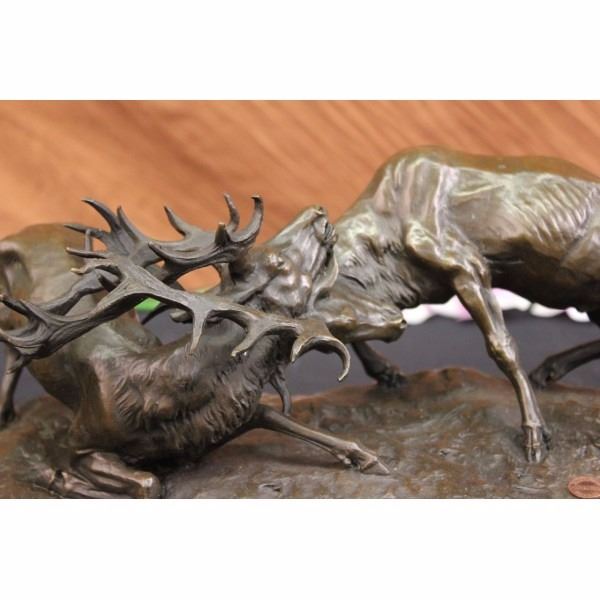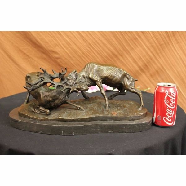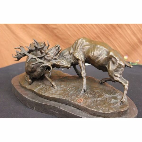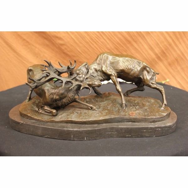 Bronze Marble Statue Elk Deer Stag Ranch Hunting Lodge It is mating season as the beholder comes across a battle of masculine might between two reindeer; the winner to gain dominion and breeding rights with the desired females, which can be between 15-20 mates. The two males have locked each others antler together and try to push each other away in a tiring feat of strength. They were molded using the ancient method of lost-wax casting and stained with a brown patina finish for preservation. They are mounted upon a variegated black marble base with the artist P.J. Mene's signature. Pierre Jules Mene (1810 - 1877) was born in Paris, France on March 25 1810. He was the most successful and prolific Animalier sculptor of his time, especially in commercial terms, and he is considered an equal to any in ability. His father was a successful metal turner who taught his son how to work with metals and the principles of casting at an early age. Condition: This sculpture is in perfect condition. Bronze Dimensions with Marble Base:Height 8" x Width 17" Marble Dimensions: Diameter 17". Height without base: 7" Weight : 25LBS Inventory : 53Y2757235