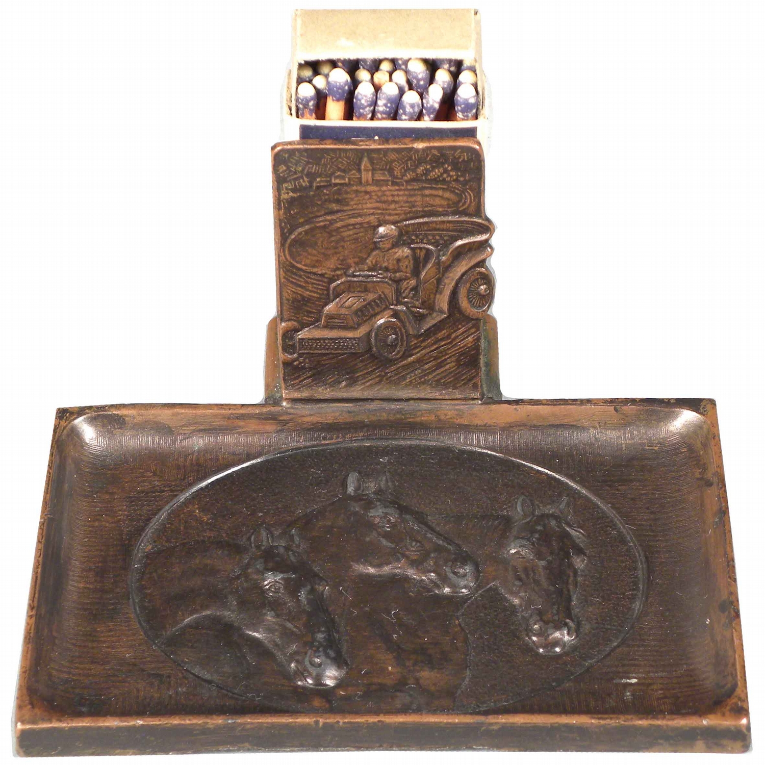 Bronze Match Holder/Ashtray. Match holder has embossed image of man driving a car. The attached ashtray has embossed horses. Very good condition. 5 X 2 1/2 X 4 1/2 inches.