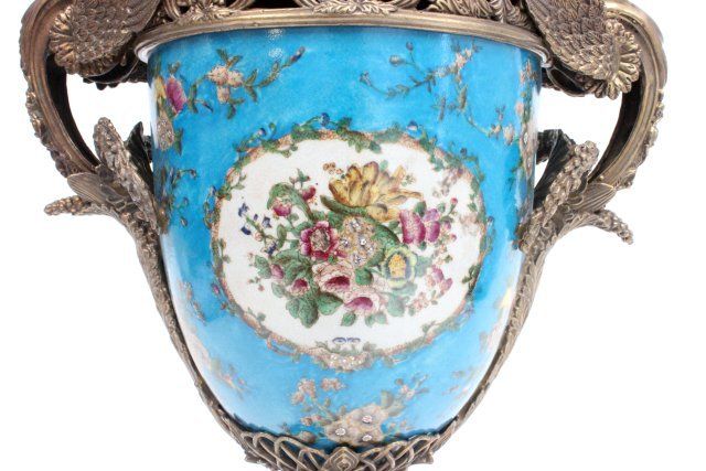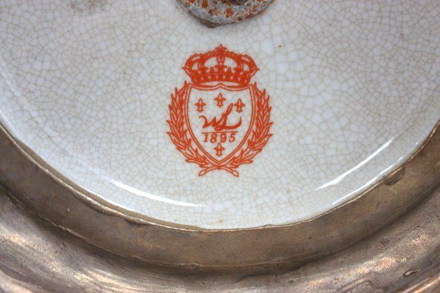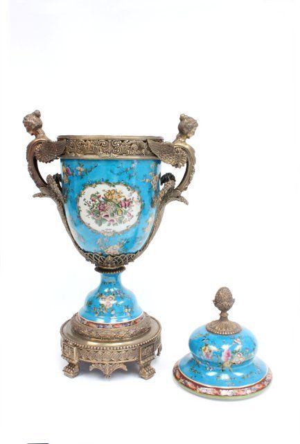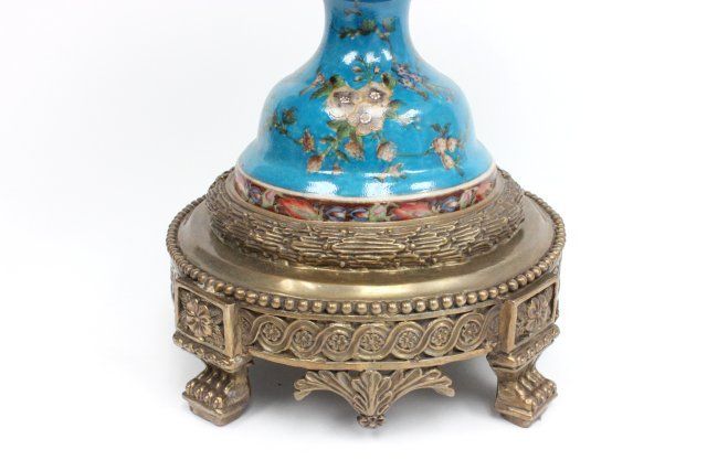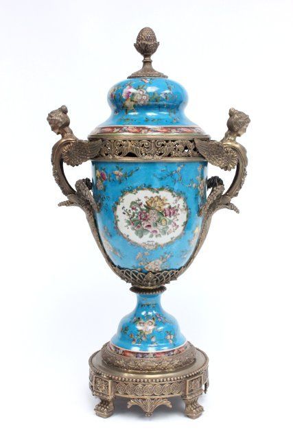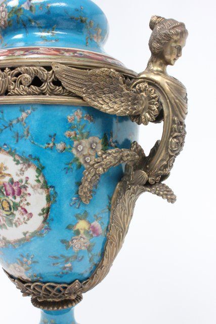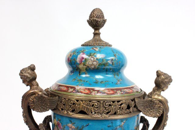 Handpainted cartouche with florals. Figural handles, acorn finial and paws feet. Approx. 25.5" X 13".