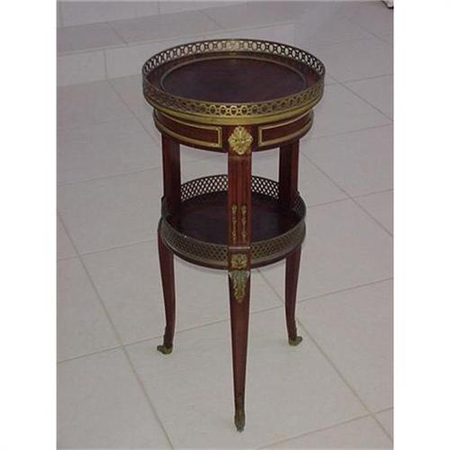 An early 20th century bronze mounted mahogany round table, 30 1/4" tall, 15" in diameter. A lovely chair side table to hold a lamp or vase of flowers, the top is ringed with a gallery as is the lower shelf. Condition is very good.