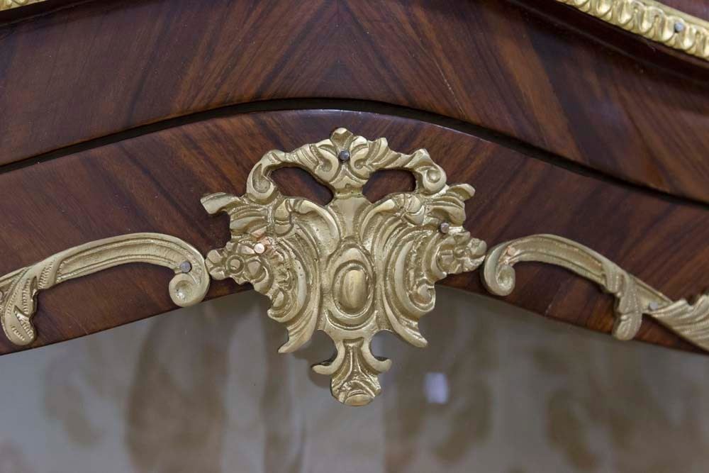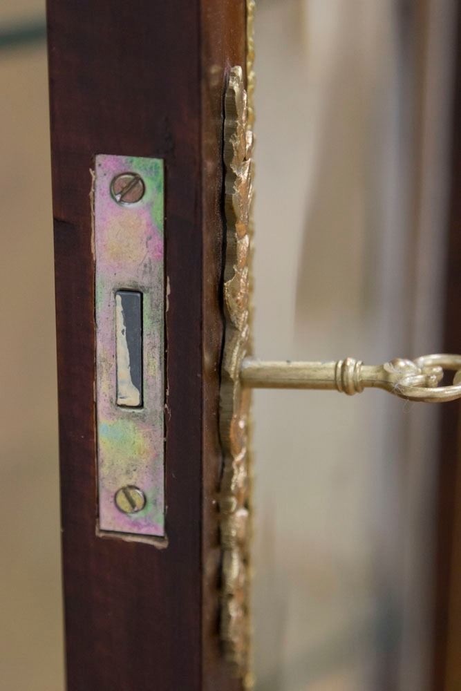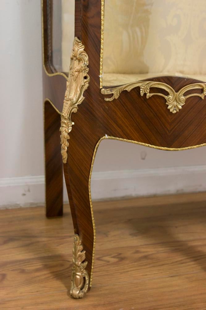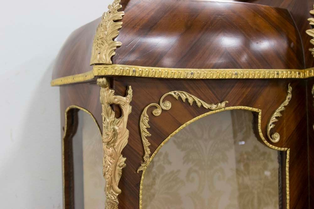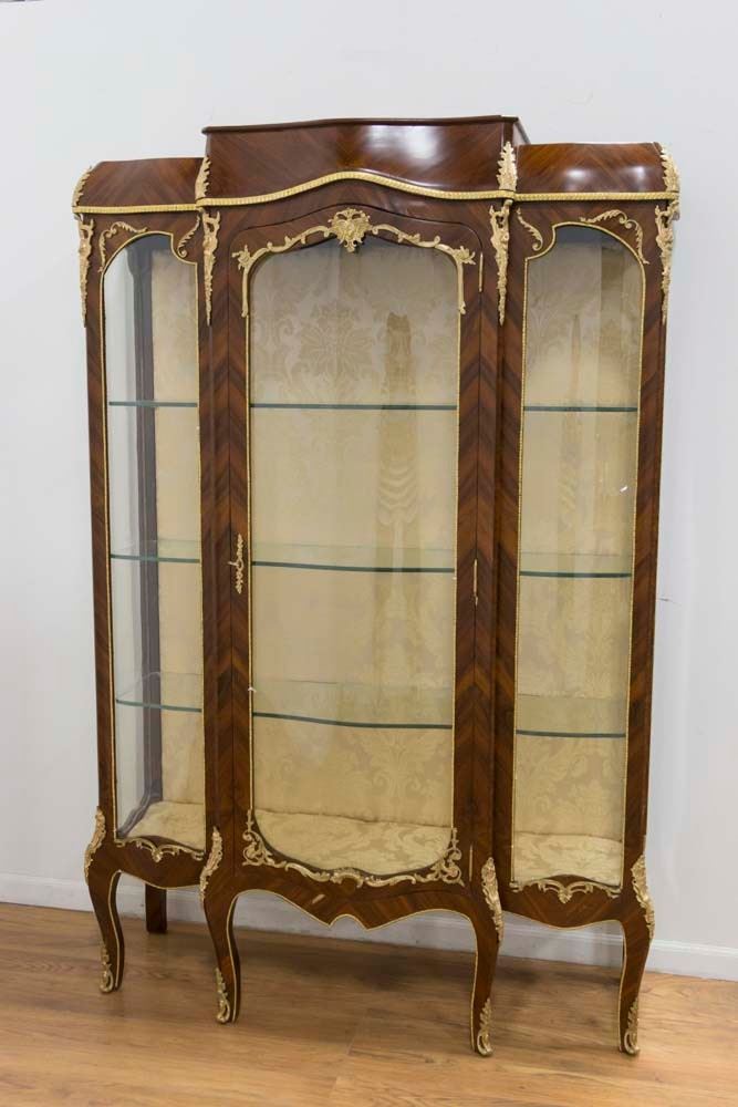 3 glass shelves. Curved glass center door. Curved glass side panels and sides. Approx. 79 1/2" H x 50 1/2" W x 16 1/2" D. Minor veneer lifting. Small chip of veneer under center door.