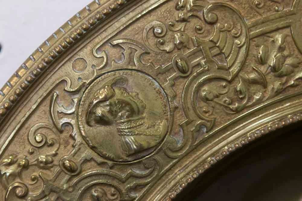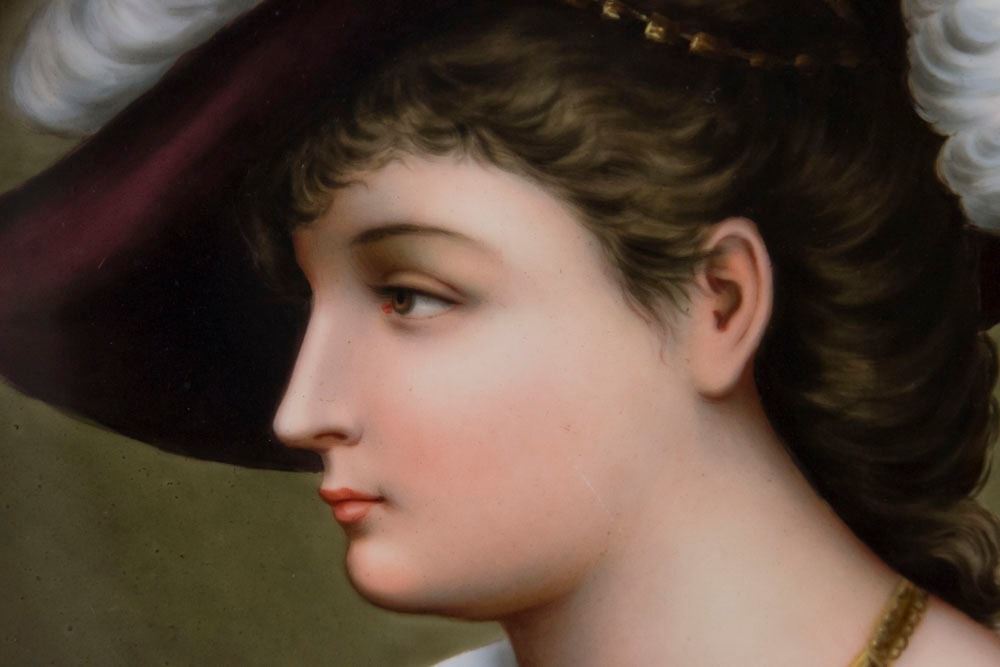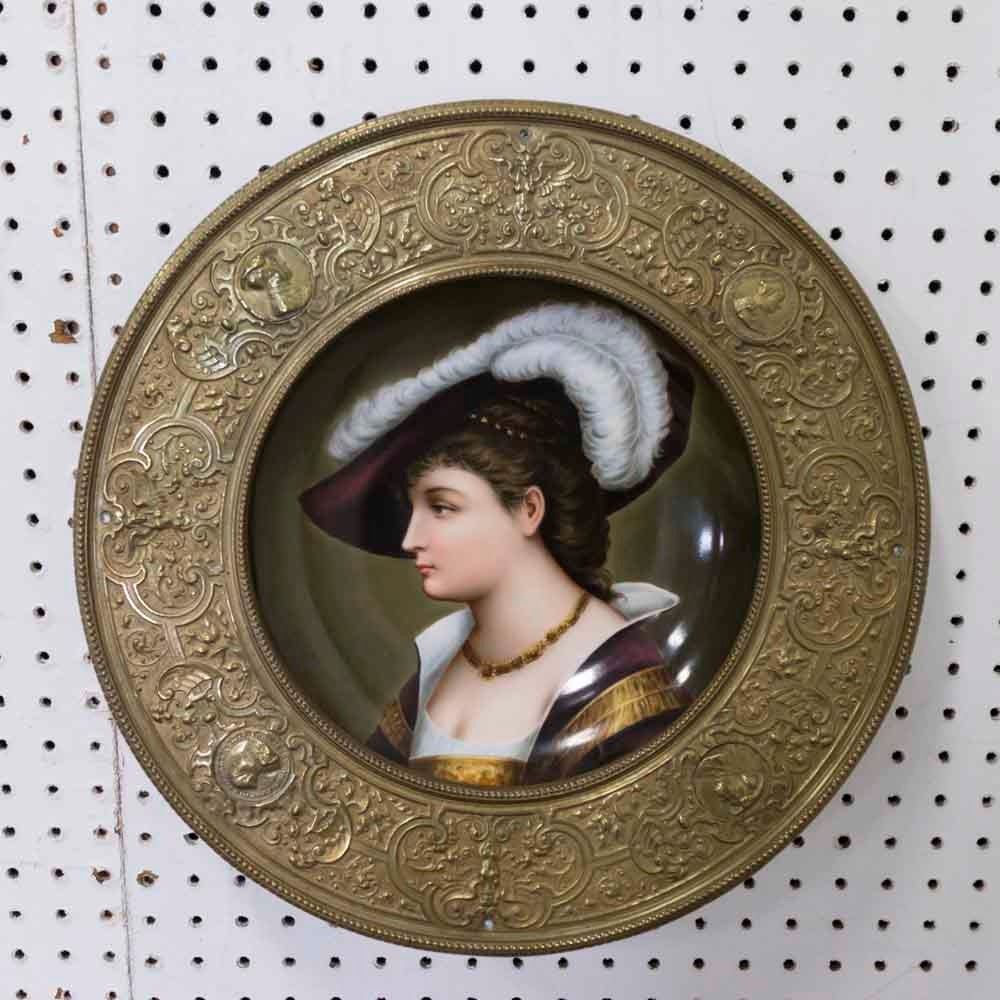 19th century. Renaissance style. Depicting a lady. Plate approx. 10" diameter, frame approx. 16 1/2" diameter. From an Edgewater, NJ estate.