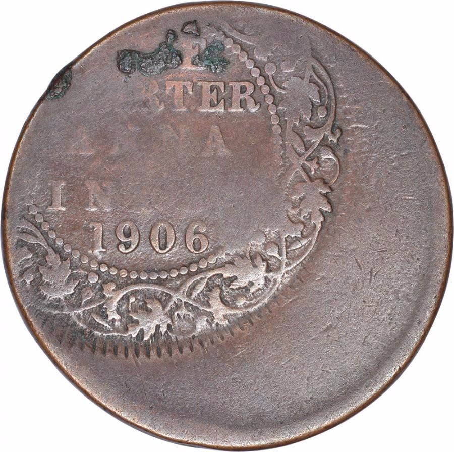 Bronze One Quarter Anna Coin of King Edward VII of Calcutta Mint of 1906.