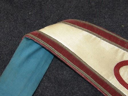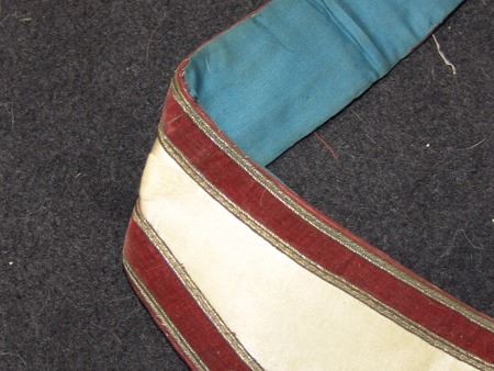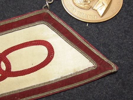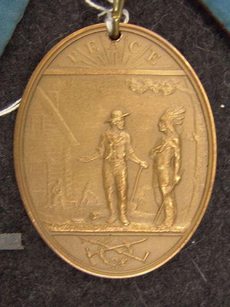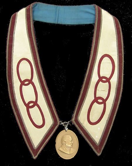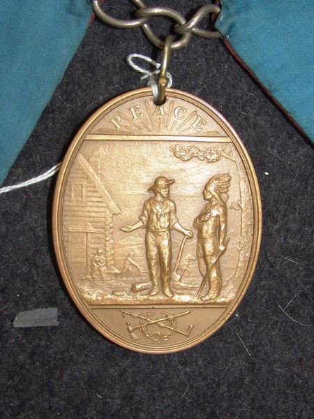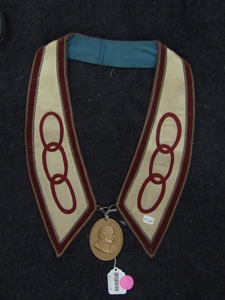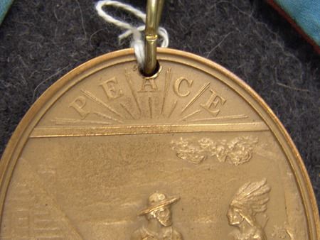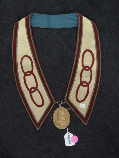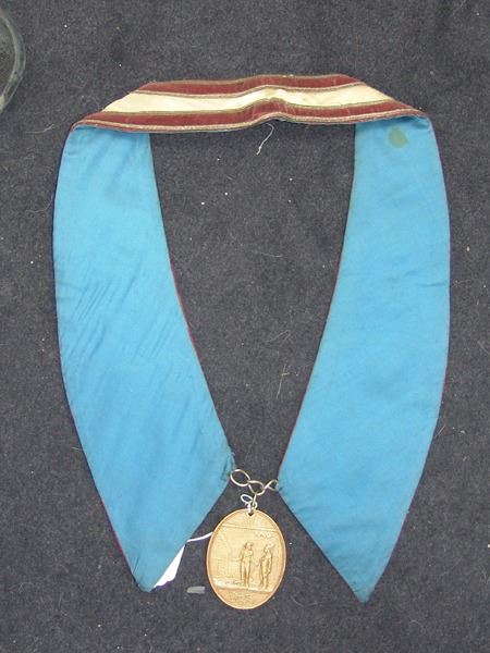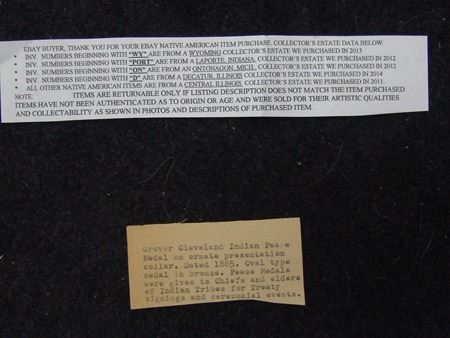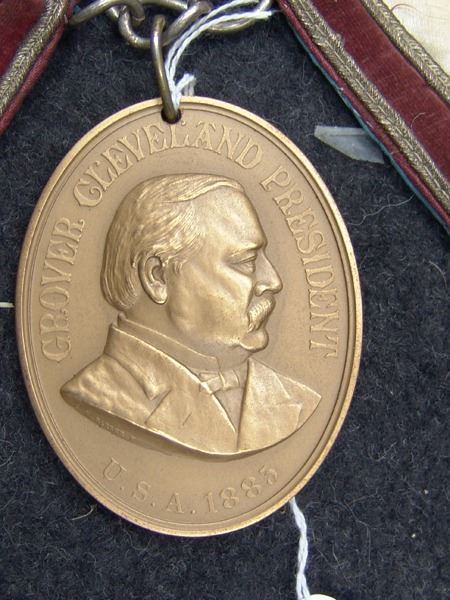 Various Ages, Labeled display showing an early 1900s silk and ribbon presentation collar holding a U.S. mint solid brass Grover Cleveland peace medal from the mid to late 1900s. Very good condition. 3" x 2-1/4" + collar