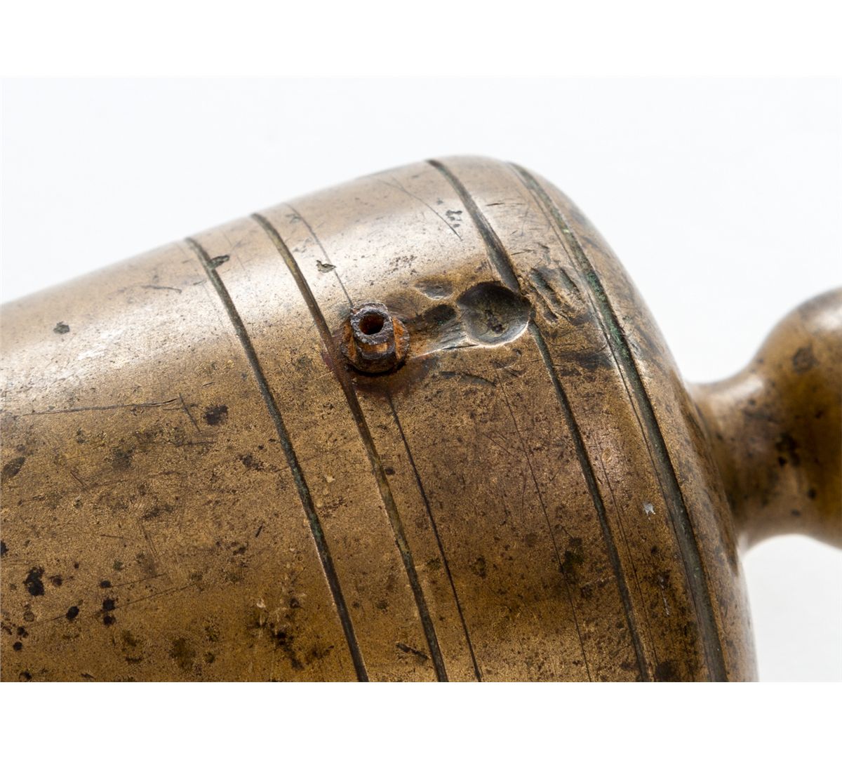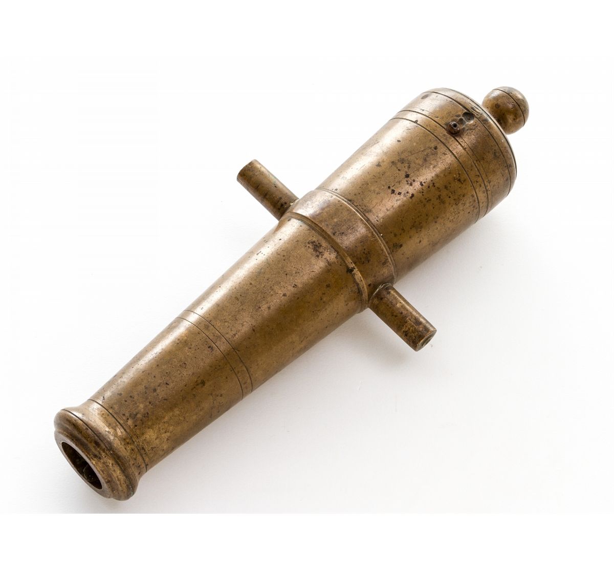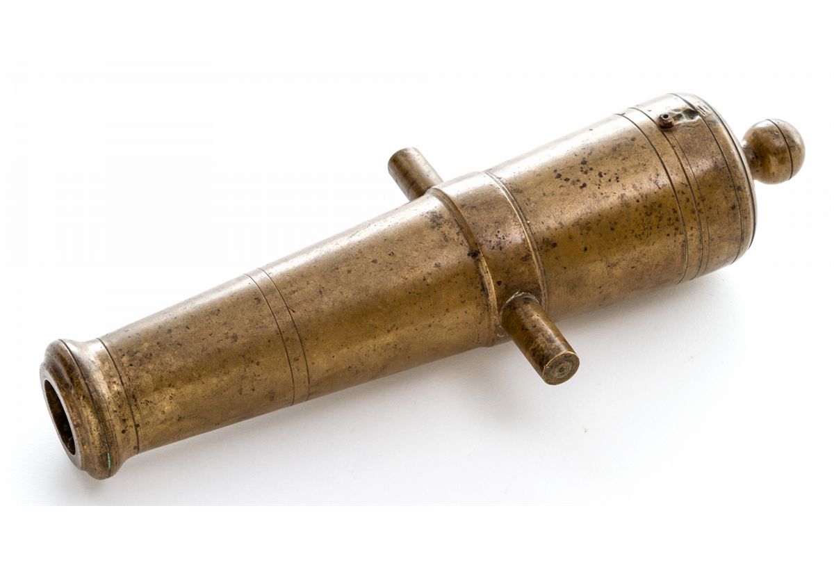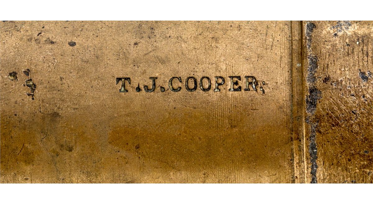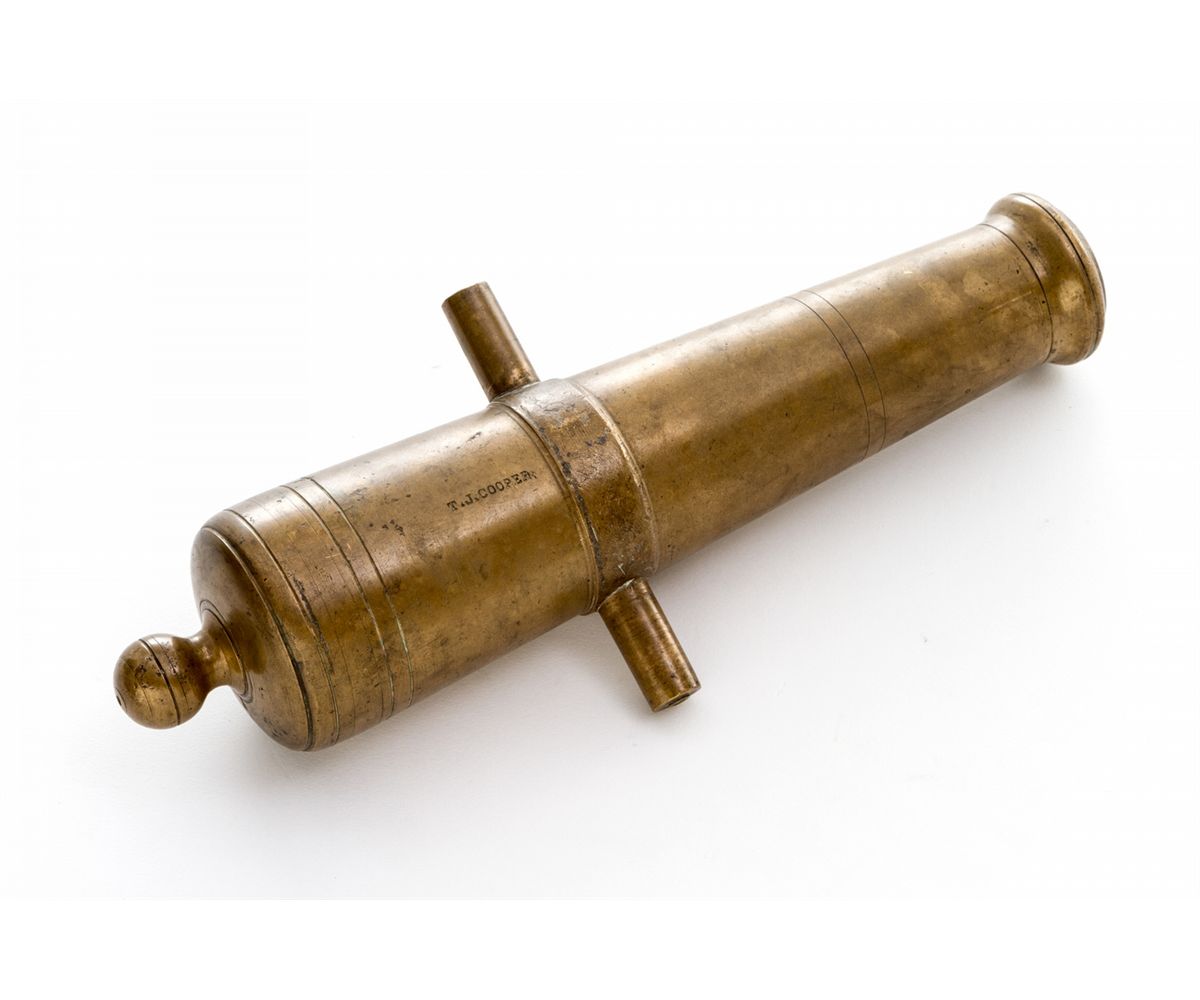 Bronze Percussion Cannon, marked ''T.J. Cooper'', 1-1/4'' bore, 13-3/4'' long, turned decorative bands, with remnants of old percussion nipple. Condition is very good to near fine with light even patina and some speckling. Lacking carriage. Est.: $500-$750. (Ernest A. Bryant III estate)