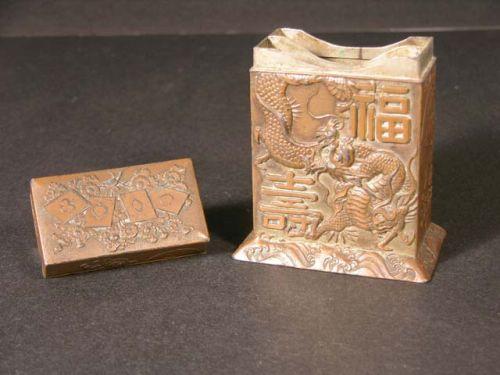 Bronze with oriental design reposse playing card holder with silver plated lining. Holds 2 decks. Circa 1900. 3" x 4" x 2" Ex. cond.