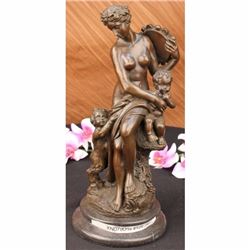 The bronze sculpture, rich in Greek mythological lore, shows a beautiful nude maiden and two child figures. She sits upon a stone with a fabric robe