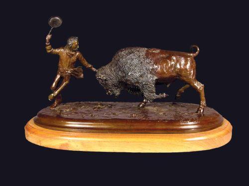 Bronze Sculpture on wood base, Cooks Coming Home with Buffalo Steak by Harland Young. Young was born in 1924 and lives in Arizona. Excellent Condition. 13 X 8 X 6 1/2 inches.
