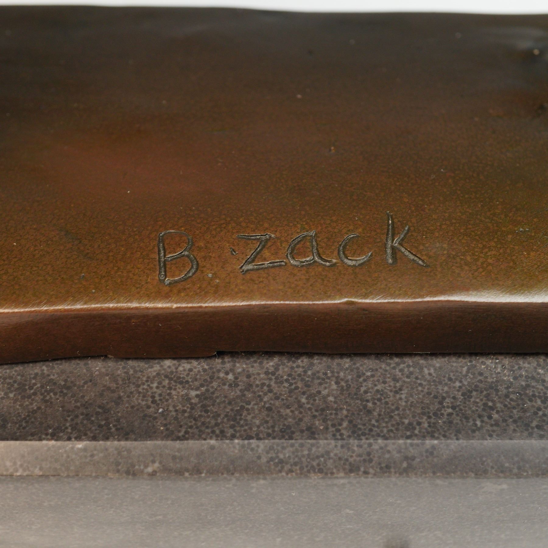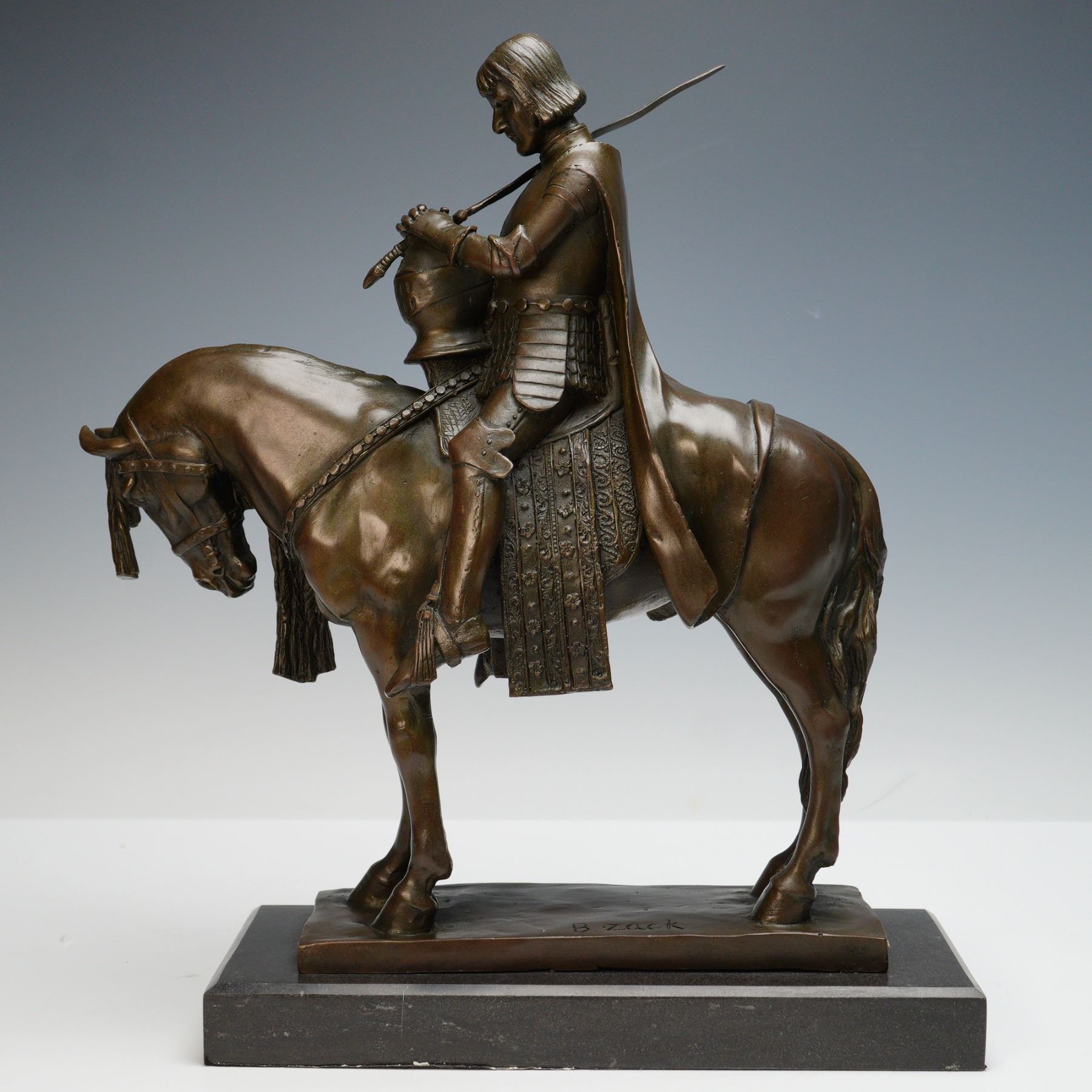 A finely cast bronze sculpture signed B. Zack, depicting a knight in full armor seated upon a horse with elaborately braided mane. The knight is shown with sword in hand, resting it across a helmet cradled in his arm, evoking a solemn moment of reflection. The work is executed with meticulous detail, from the ornate armor and drapery to the horse's decorative tack and naturalistic stance. Raised on a rectangular base.