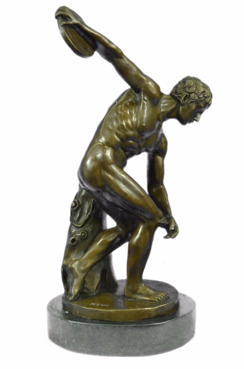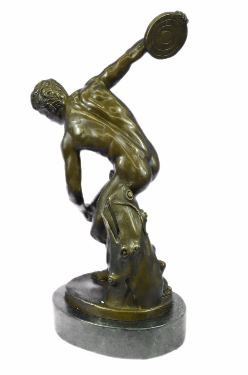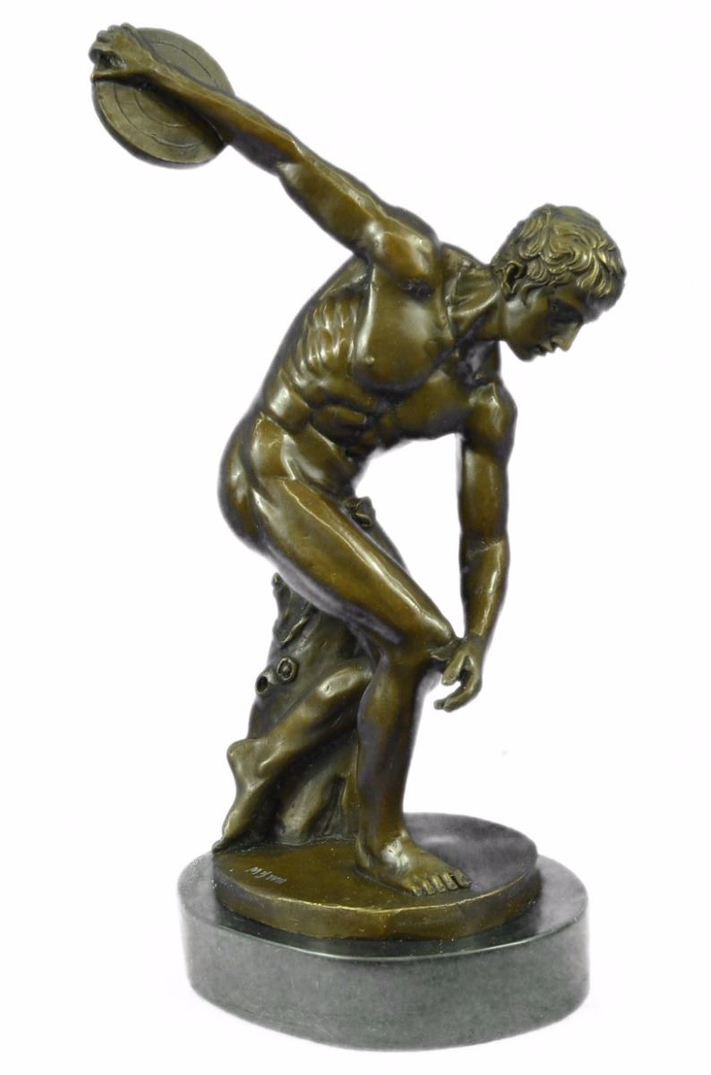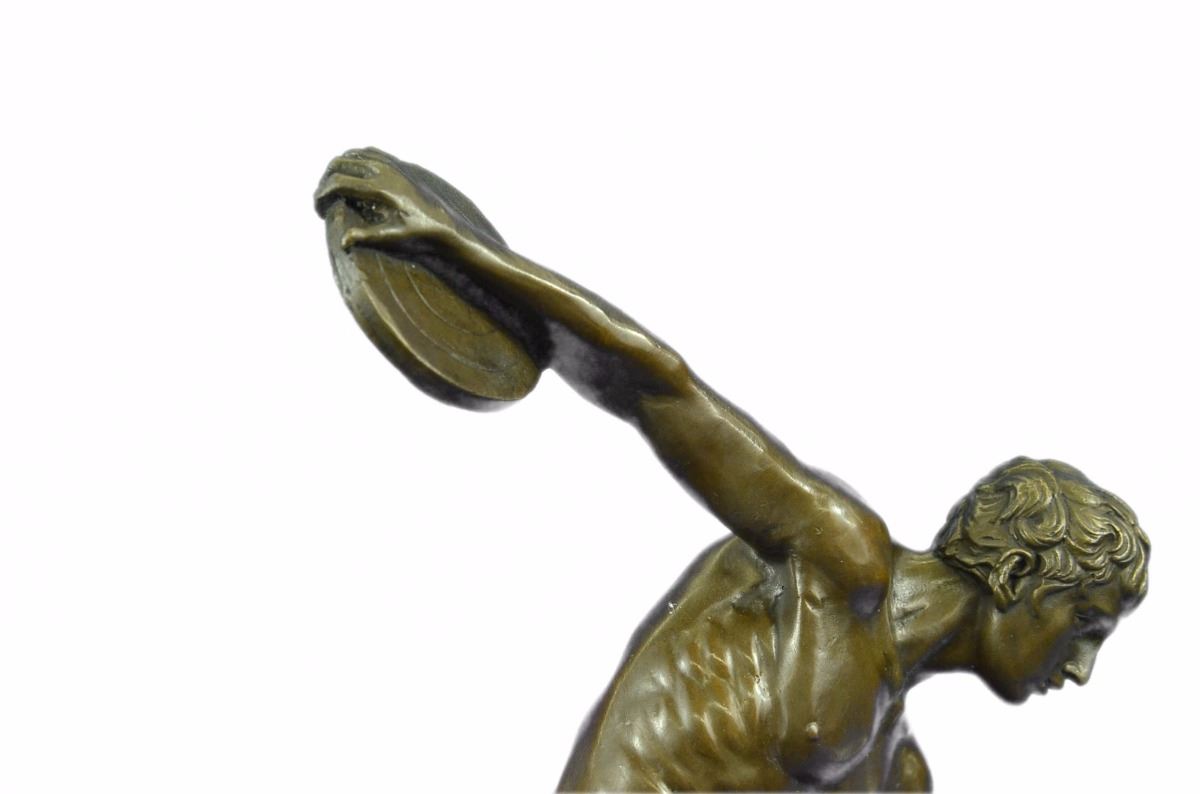 This Is A Bronze Replica Of "The Discobolus Of Myron" Which Is A Famous Greek Sculpture That Was Completed Towards The End Of The Severe Period, Circa 460-450 Bc. The Original Greek Bronze Is Lost. It Is Known Through Numerous Roman Copies, Both Full-Scale Ones In Marble. Here A Discus Thrower Is Depicted About To Release His Throw. The Moment Thus Captured In The Statue Is An Example Of Rhythms, Harmony And Balance One That Has Endured A Pattern Of Athletic Energy. The Potential Energy Expressed In This Sculpture's Tightly-Wound Pose, Expressing The Moment Of Stasis Just Before The Release, Is An Example Of The Advancement Of Classical Sculpture From Archaic. The Sculpture Was Cast Using The Early Method Of Lost-Wax Casting And Stained With A Brown Patina Finish For Preservation. It Is Mounted Upon A Black Marble Base. Bronze Dimensions With Marble Base: Height 16 X Width 11 inches. Weight: 15 Lbs.