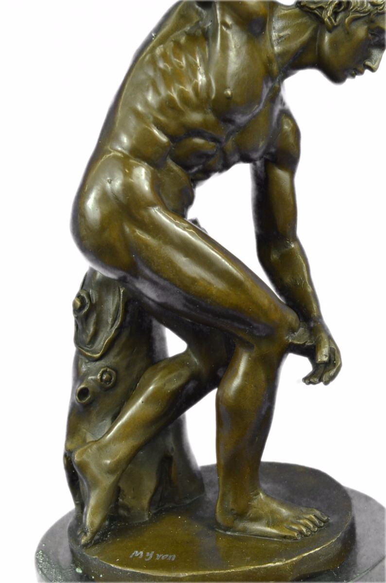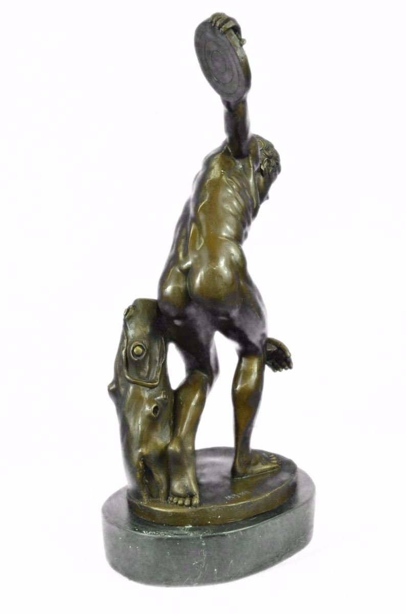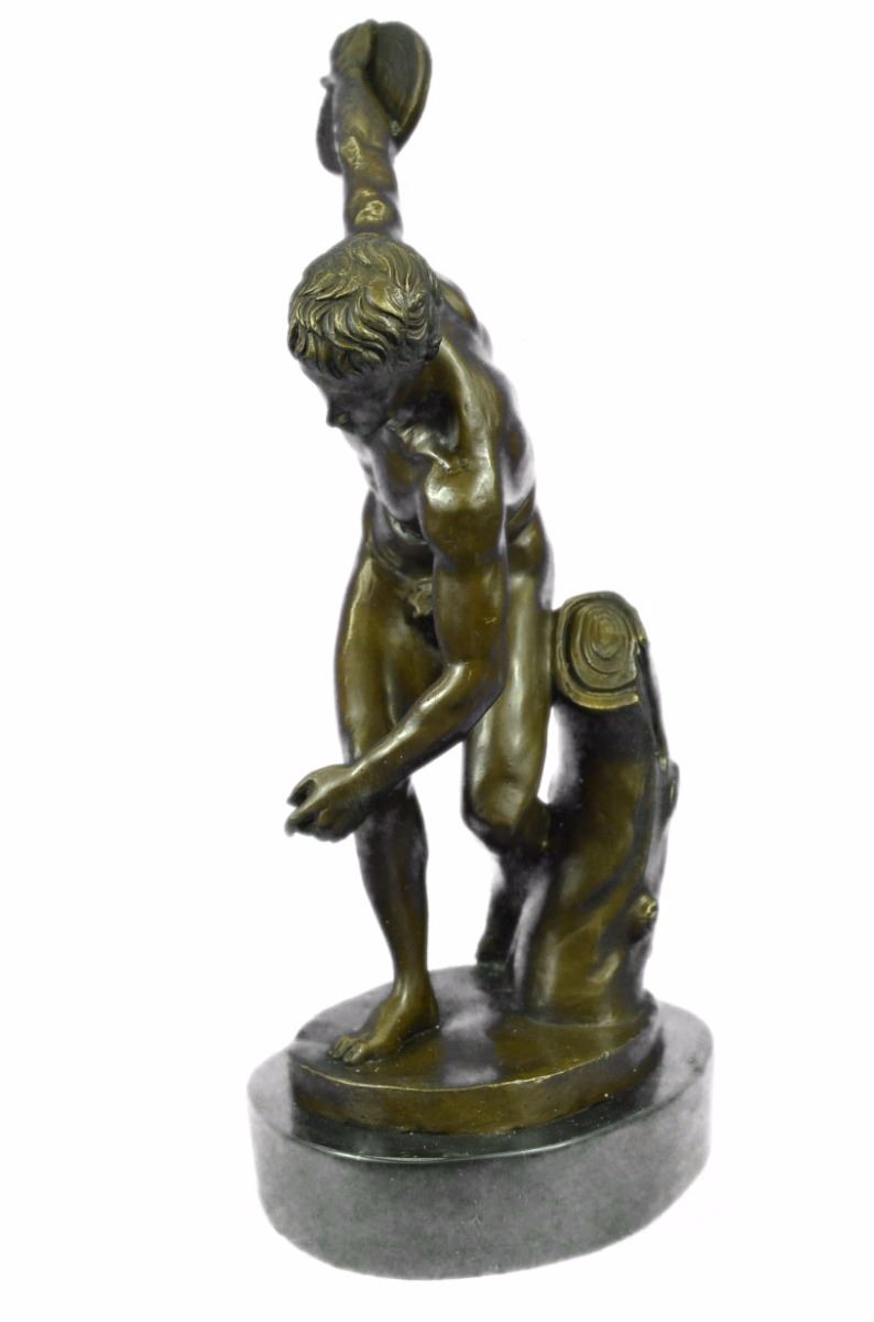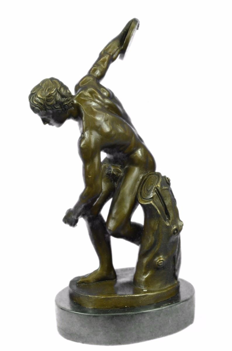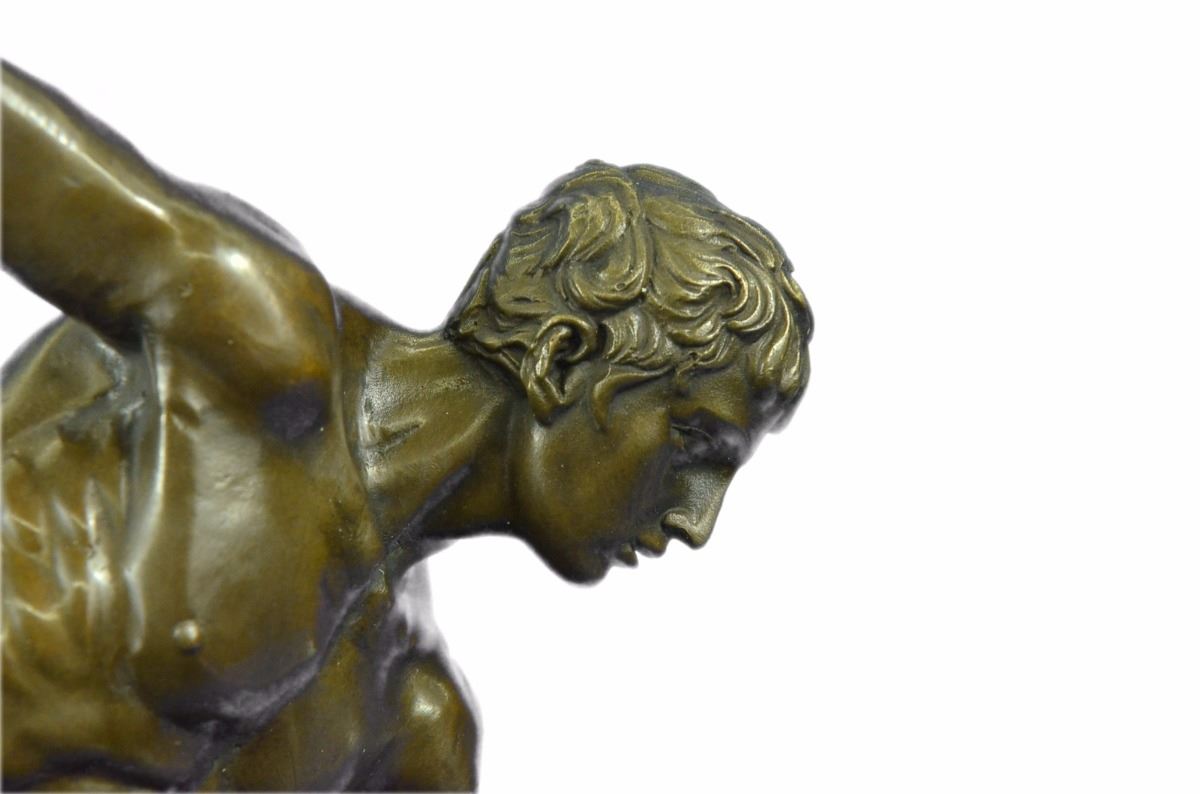This Is A Bronze Replica Of "The Discobolus Of Myron" Which Is A Famous Greek Sculpture That Was Completed Towards The End Of The Severe Period, Circa 460-450 Bc. The Original Greek Bronze Is Lost. It Is Known Through Numerous Roman Copies, Both Full-Scale Ones In Marble. Here A Discus Thrower Is Depicted About To Release His Throw. The Moment Thus Captured In The Statue Is An Example Of Rhythms, Harmony And Balance One That Has Endured A Pattern Of Athletic Energy. The Potential Energy Expressed In This Sculpture's Tightly-Wound Pose, Expressing The Moment Of Stasis Just Before The Release, Is An Example Of The Advancement Of Classical Sculpture From Archaic. The Sculpture Was Cast Using The Early Method Of Lost-Wax Casting And Stained With A Brown Patina Finish For Preservation. It Is Mounted Upon A Black Marble Base. Bronze Dimensions With Marble Base: Height 16 X Width 11 inches. Weight: 15 Lbs.