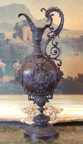 Bronze Ornate Urn, Bronze Sculpture, 20 "Hx 8"W x 6"D 15 lbs This bronze sculpture was produced using the "Lost Wax" casting method. The"Lost Wax" Cast method is the most precise metal casting technique in existence, ensuring exquisite detail of the original host model which is usually sculpted in clay or wax. This "Lost Wax" casting method is an extremely labor intensive and expensive process, but the end results produce a Heirloom Quality Masterpiece!