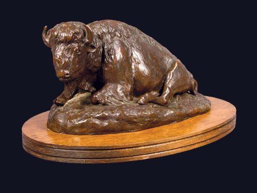 Bronze Sculpture on wood base, The Recumbent Buffalo by George Dabich, born in 1922 and living in Wyoming. Signed and Dated 1964. Excellent Condition. 9 1/2 X 5 1/2 X 5 inches.