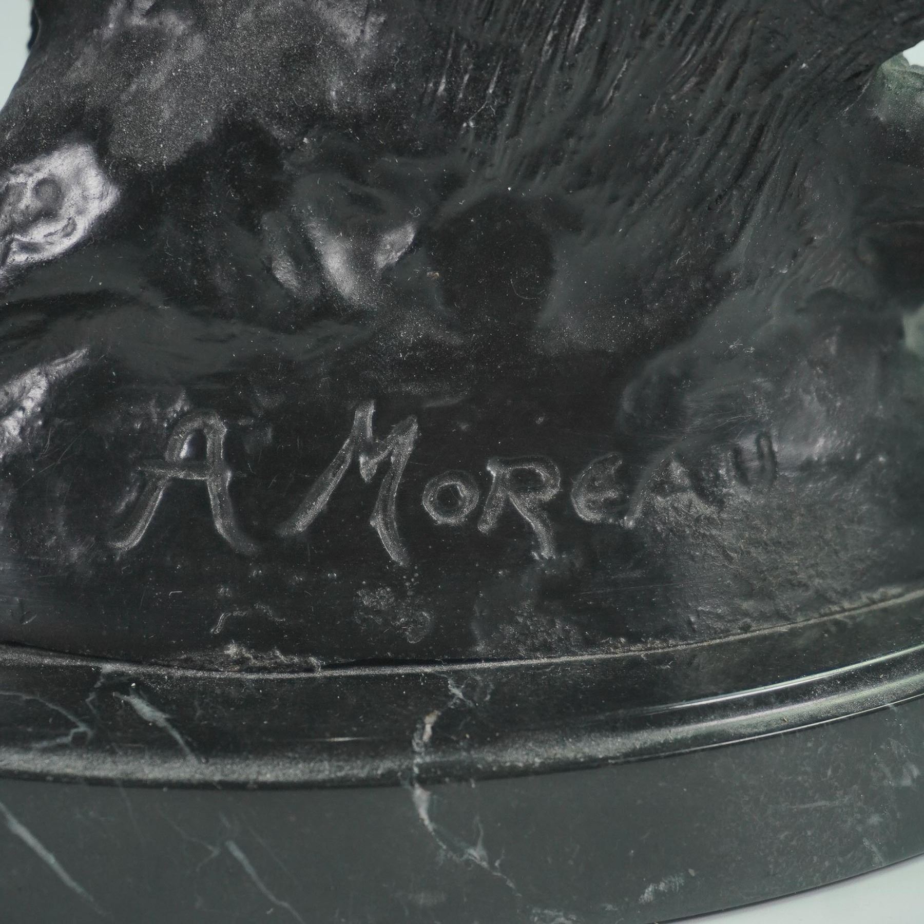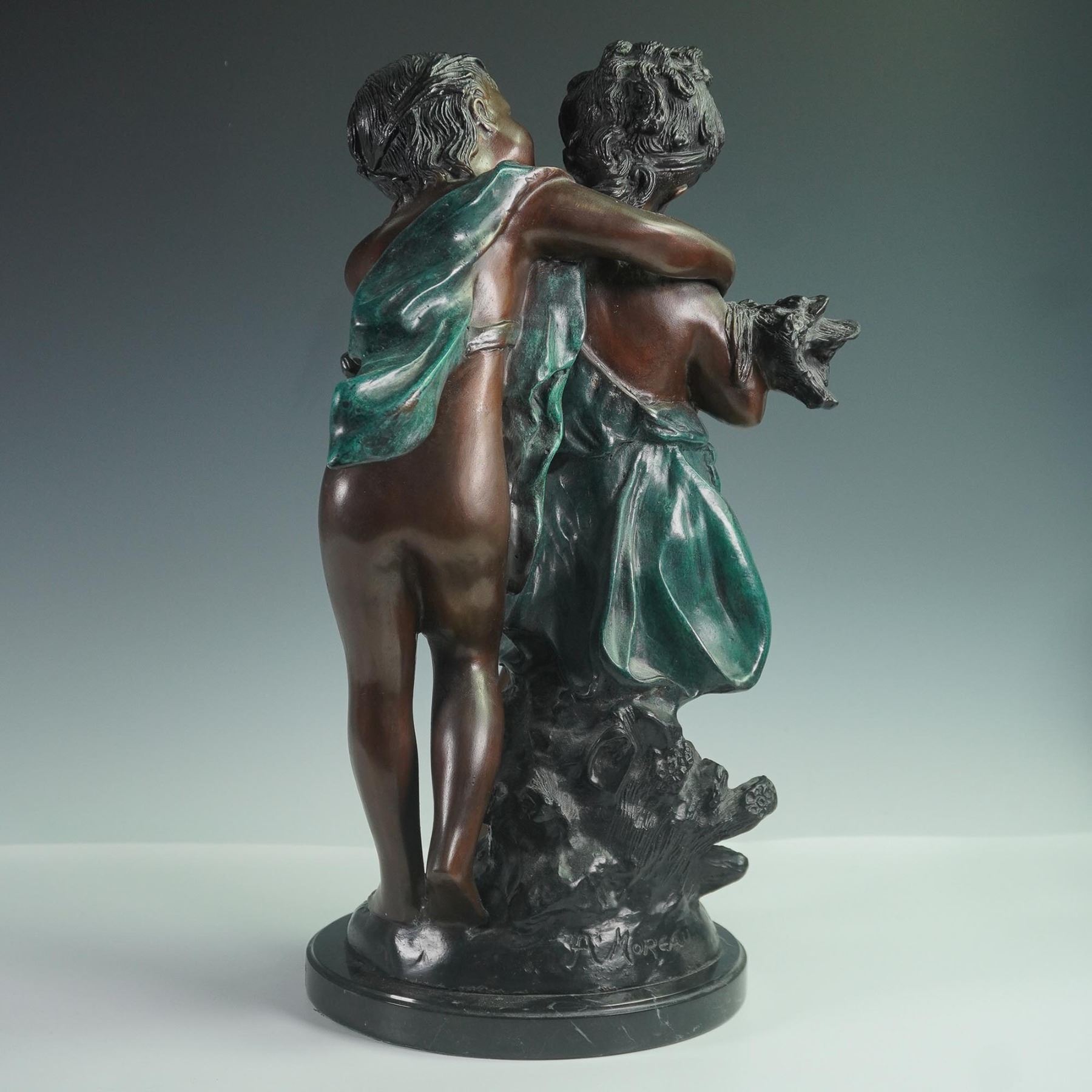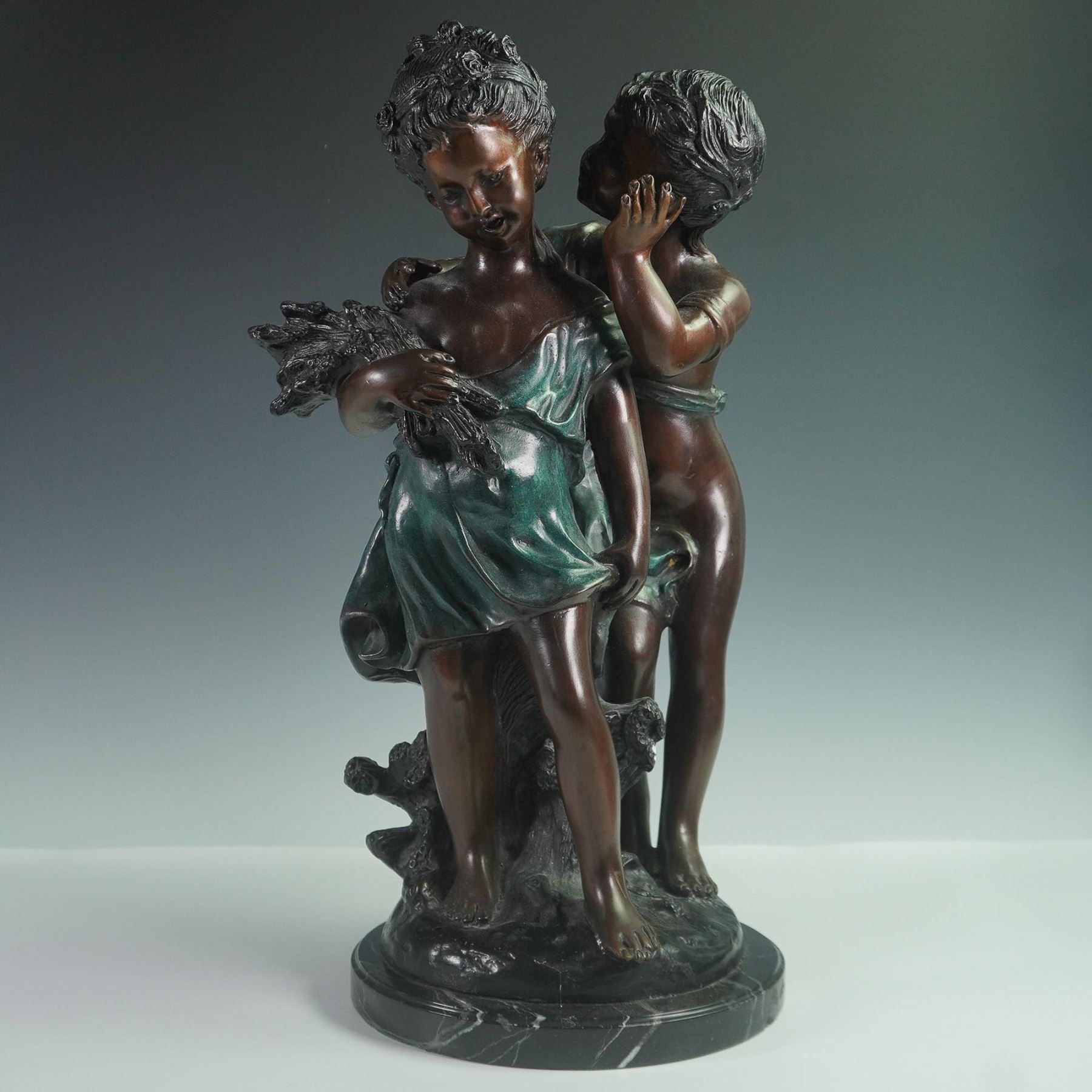 Finely detailed figural sculpture in the style of Auguste Moreau, depicting two young children in an affectionate pose, one whispering while the other clutches a small bouquet. Cast in a dark patinated finish with green-toned highlights and mounted on a black faux marble base. The piece is signed A. Moreau along the lower edge. A graceful and expressive work capturing youthful innocence in the romantic tradition of 19th-century French sculpture.