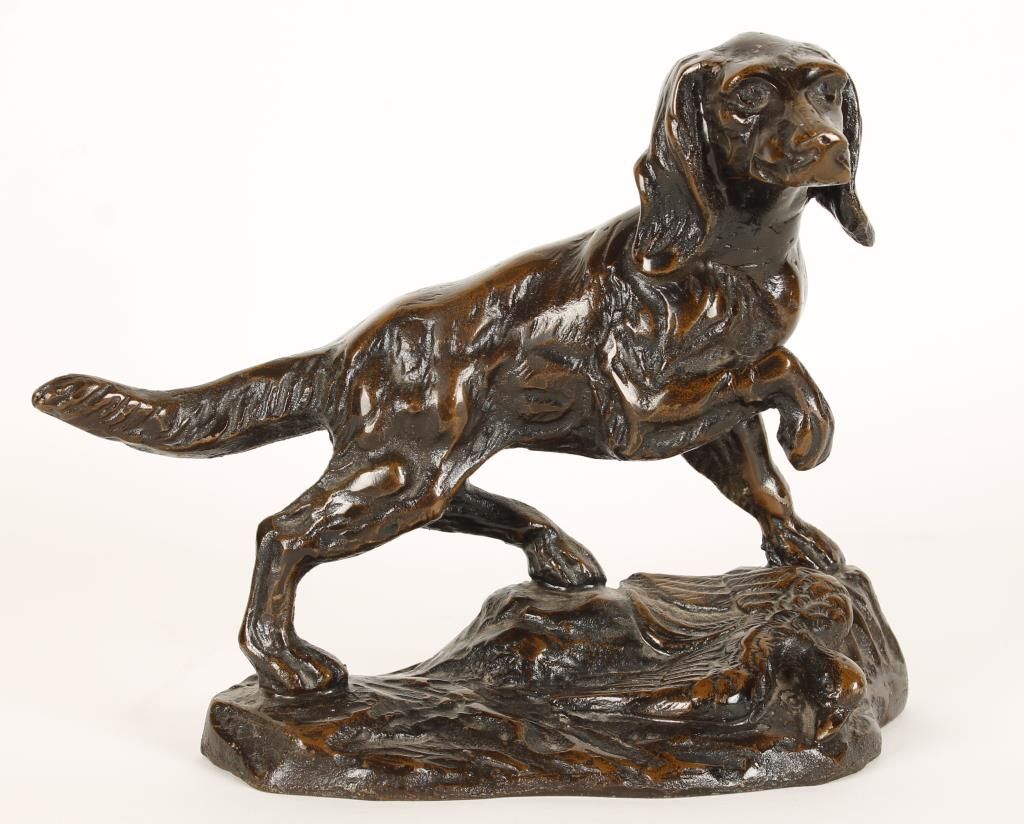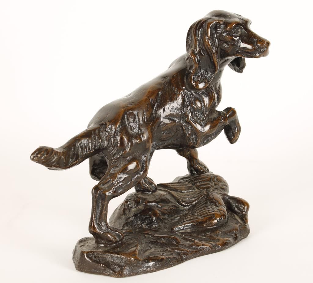 Faithful setter on point over a duck. Rustic textured sculpture in dark browns.