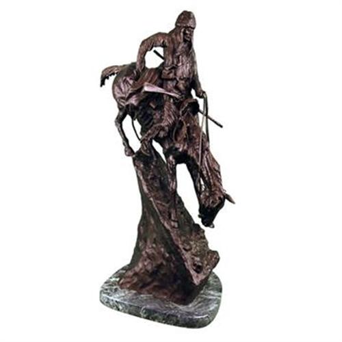 Bronze sculpture of an Indian on horseback traveling down the mountain. A Frederic Remington recast, stamped "copyright Remington" on the bottom of the sculpture. Mounted on a green marble base. Sculpture stands 28" tall. Base measures 11.5" x 12". Great condition. Late 20th C.