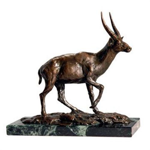 A bronze sculpture by artist Terry Mathews of a water buck. Mounted on a green marble base, measuring 10" x 4". The buck measures 9.5" tall and 8" wide, 7.2 lbs. Signed on the base "T.O. Mathews 1974 3/10". Terry Mathews was born in England, brought up in Uganda and educated in Kenya and England. He is known for his wildlife artwork and is a supporter of many conservation organizations. He has shown in over 30 exhibitions in Europe, America and Africa.