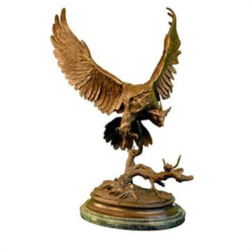 A large bronze scupture of an owl with wings spread. Mounted on an oval marble base, measuring 16" x 12". Sculpture measures 33.5" tall, 24" wide and 9.5" deep. Unsigned. 20th C. There are two small chips in the marble on the front of the base. Sculpture is in good condition.