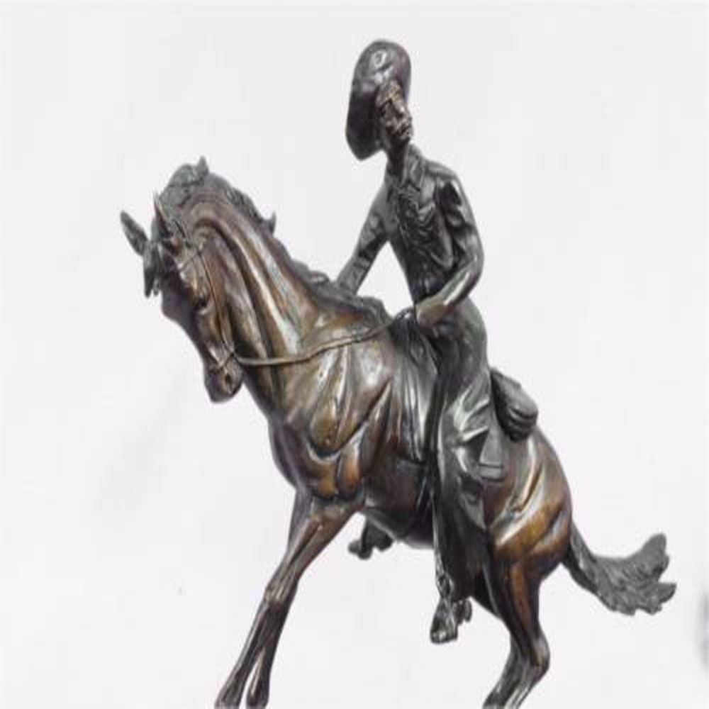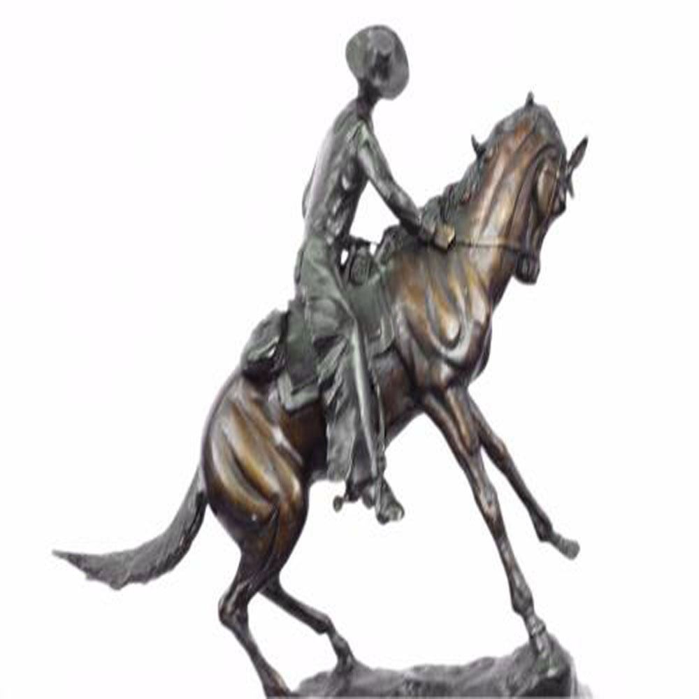 A seasoned cowboy is casually patrolling the area, when suddenly something catches his attention. He pulls down on his reins and brings the horse about. His horses head pulls back. He leans forward and looks out towards the noise. He is dressed in a shirt, chaps, hat and boots, giving him the look of a good ole fashioned sheriff. This two toned brown patina Sculpture was cast using the Lost Wax Method and mounted on a marble base. Bronze Dimensions with Marble Base: Height 17 X Width 21 inches. Weight: 22 LBS.