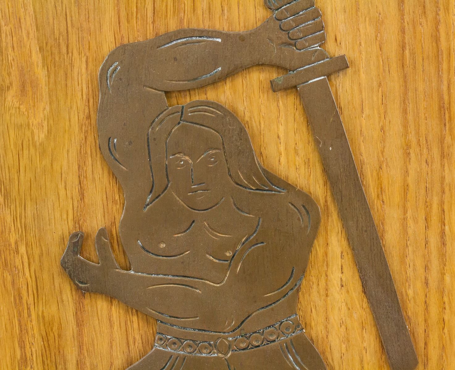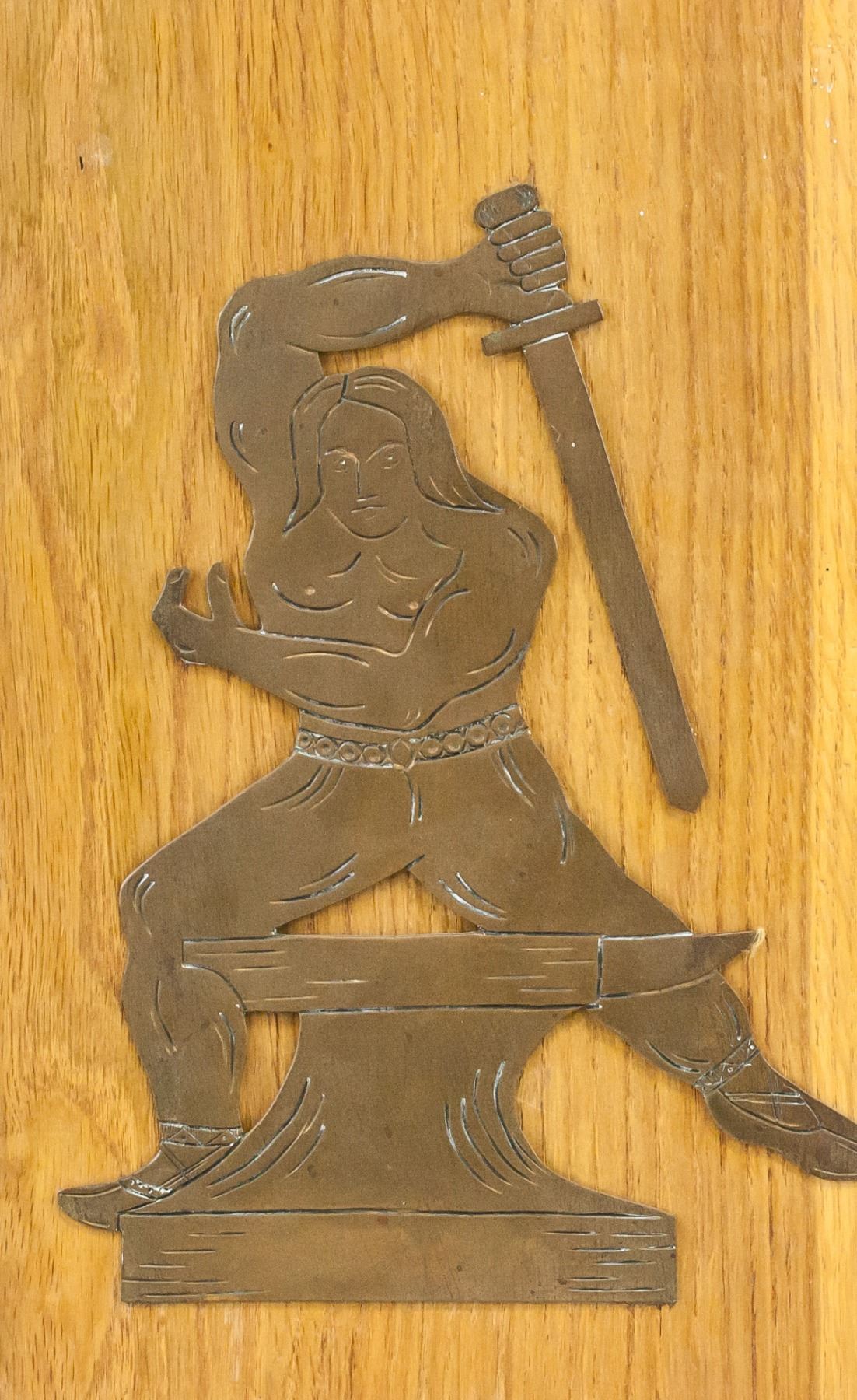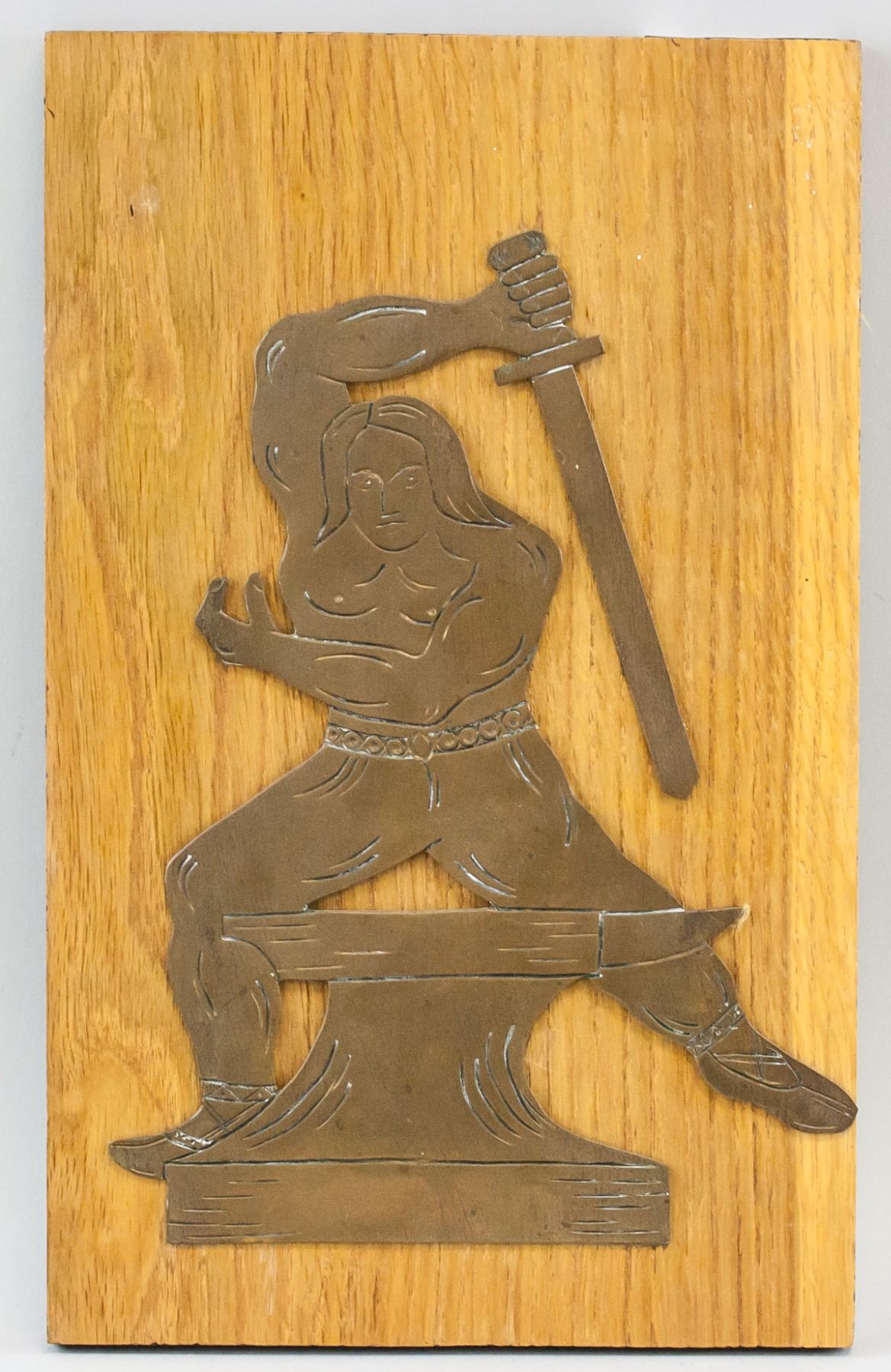 Bronze sculpture on wood. Featuring a bare-chested man swinging a sword at an anvil. 30 x 19 cm (12 x 7.5 in).