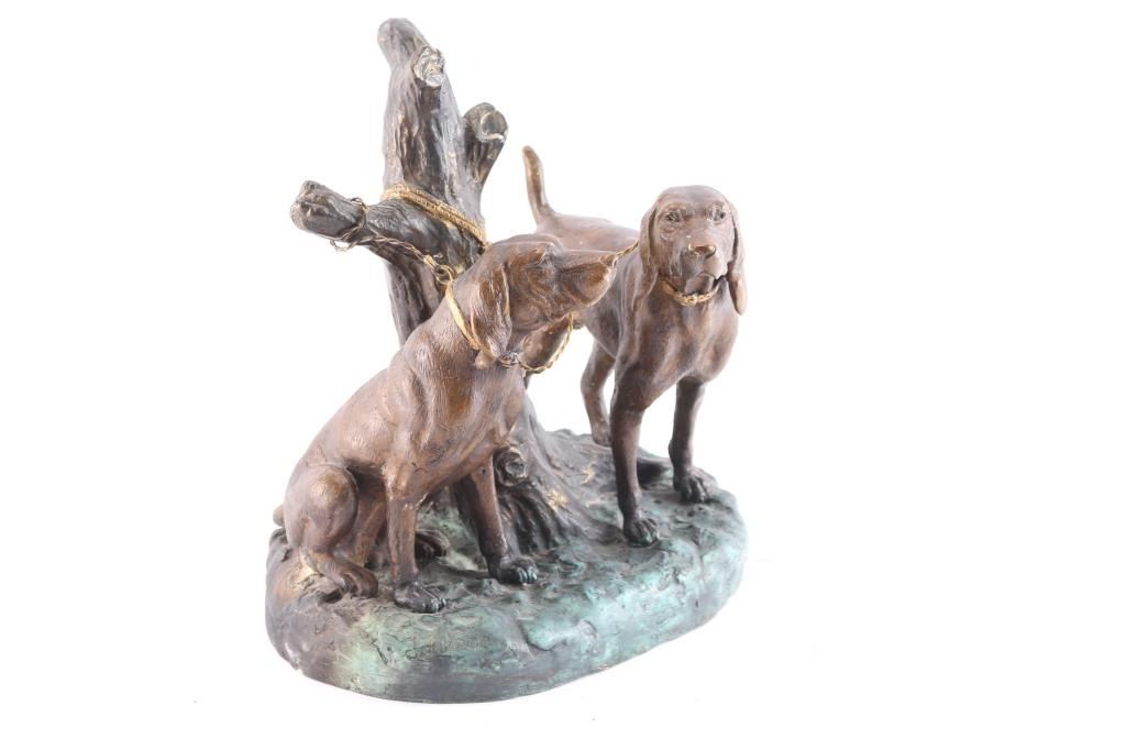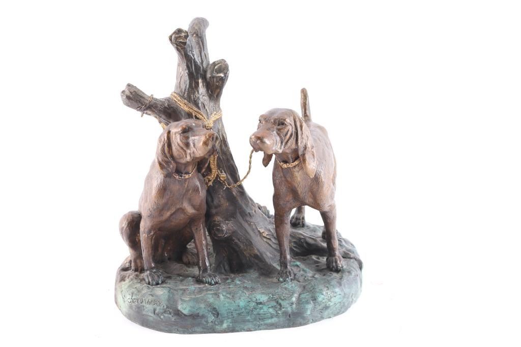 Signed bronze of two hound dogs tied to a tree, colored bronze measures 12.5"X13.5. BUYER MUST ARRANGE OUTSIDE SHIPPING!