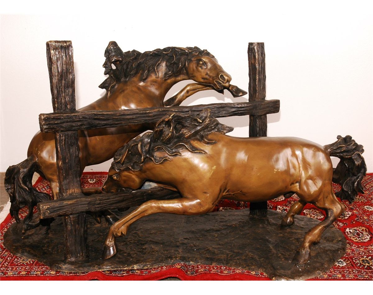 Bronze base of two horses on either side of a fence.  Hold glass table top.  Sold without glass.