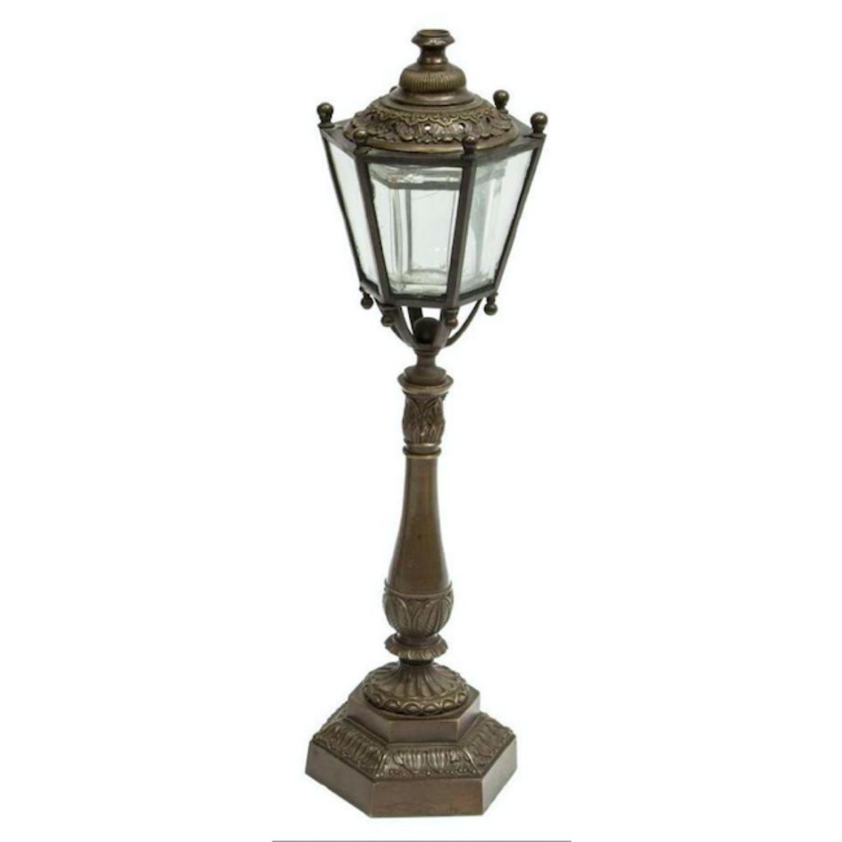 Bronze tabletop cigar lighter, in the form of a street lamp, having a removable glass oil reservoir. Approx 12" H, 3 3/4" D. 7.5 lbs . * crack to glass. - 10624-052018-LA-03296