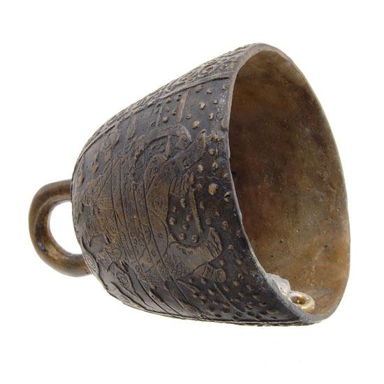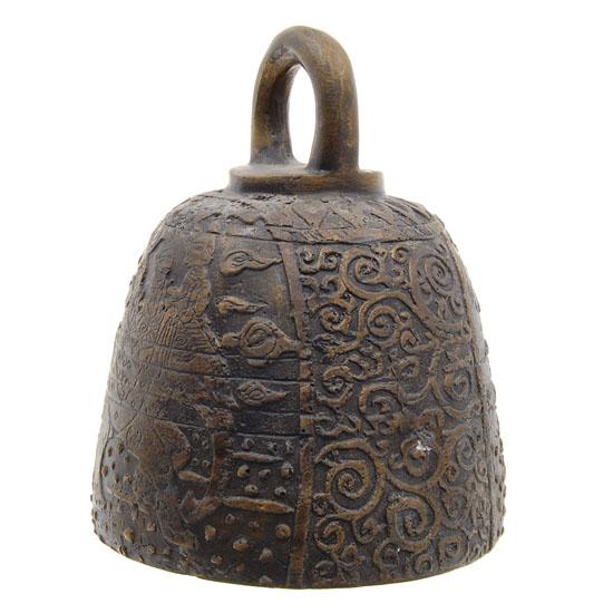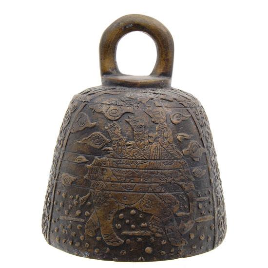 Excellent bronze piece with monks riding elephant design; new bell clapper; 5.5"