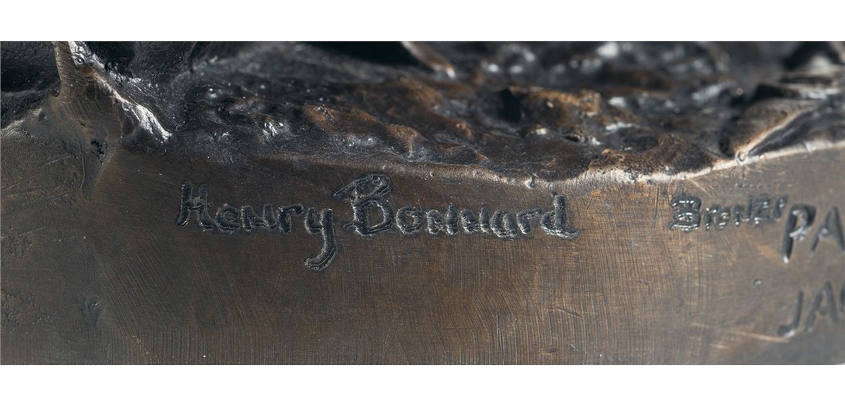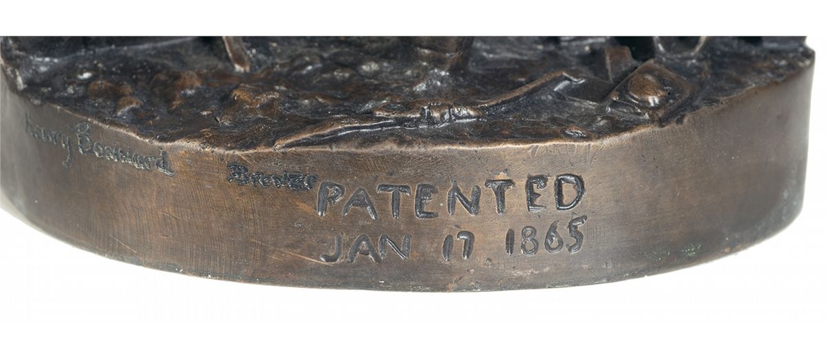 This was his most popular work on the American Civil War, challenged only by one of his other works "Council of War" (patented 1868). Most of Roger's (Am: 1829-1904) statues were plaster cast with this example cast in bronze. This sculpture patented in 1865 depicts two courageous wounded veterans with one lingering to have one more shot at the enemy before retreating to the hospital. Roger's gifted statuary on this stirring subject to veterans who admired the subject and the impressive manner of its presentation. General George A. Custer and his wife reportedly carried a statue similar to this with them from army post to army post along with other Rogers statuary. Signed "JOHN ROGERS/NEW-YORK". Measures approximately 23 1/2 inches in height and weighs 43 Pounds.