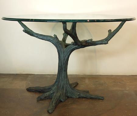 This stunning pure bronze table base has been crafted to the highest standards . This table stands 30" high by 43.5" at its maximum width. It may be topped with either a round or rectangular piece of glass, at the customer's choosing. It also may be finished in a variety of patina choices, including the greenish-brown patina shown, a classic brown patina, or in a lighter driftwood patina.