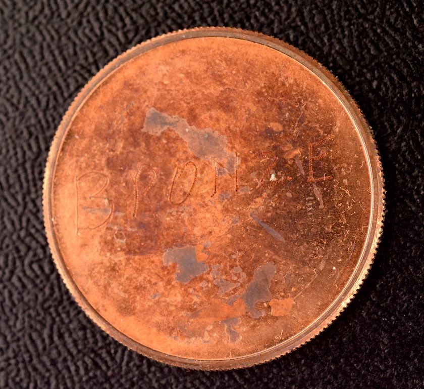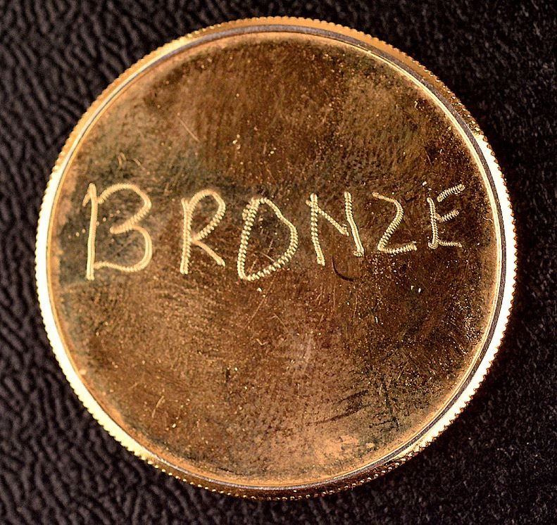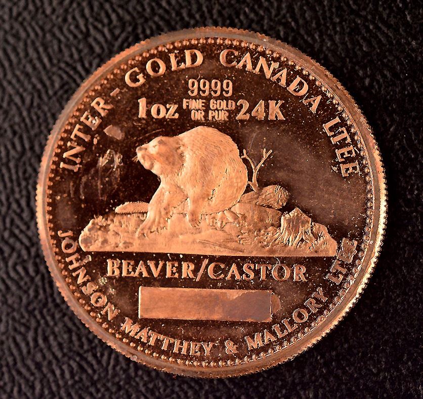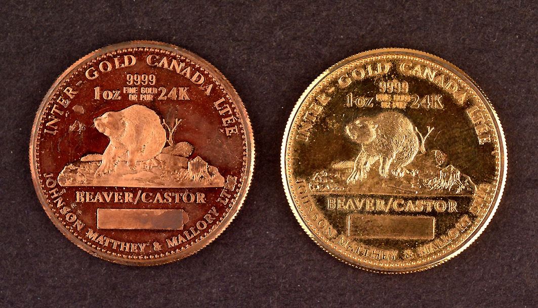 Inter Gold Canada Ltee, Johnson Matthey & Mallory, Ltee, Bronze Trials, (2), for the one ounce gold "Beaver" series, which began in 1977. Both are uniface, with "Bronze" scratched on the blank obverse side. Reverse shows the common "Beaver" reverse. First, copper colour, 14.45 gms, 31.82 mm; second, gold plated, 14.59 gms, 31.80 mm; both AU, with PVC. The gold Beaver collector series, which only lasted a few years was some of the best artwork we have witnessed on bullion items and are seldom seen today.