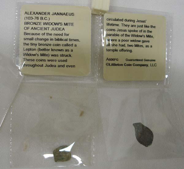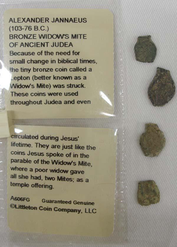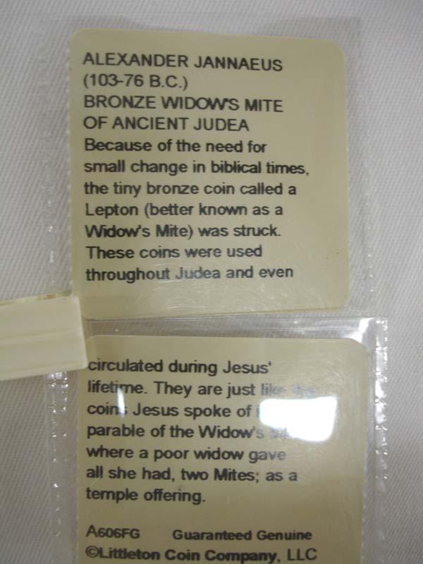 4 Bronze Widow's Mite coins, Leptons, Littleton Coin Company. Circulated in Biblical times, ancient Judea, 103-76 B.C. Parable: Widow gave Jesus all she had, mites, as a temple offering. Guaranteed Genuine in original packages. Buyers Pay Actual Shipping and Handling Charges(see terms and conditions for more information).