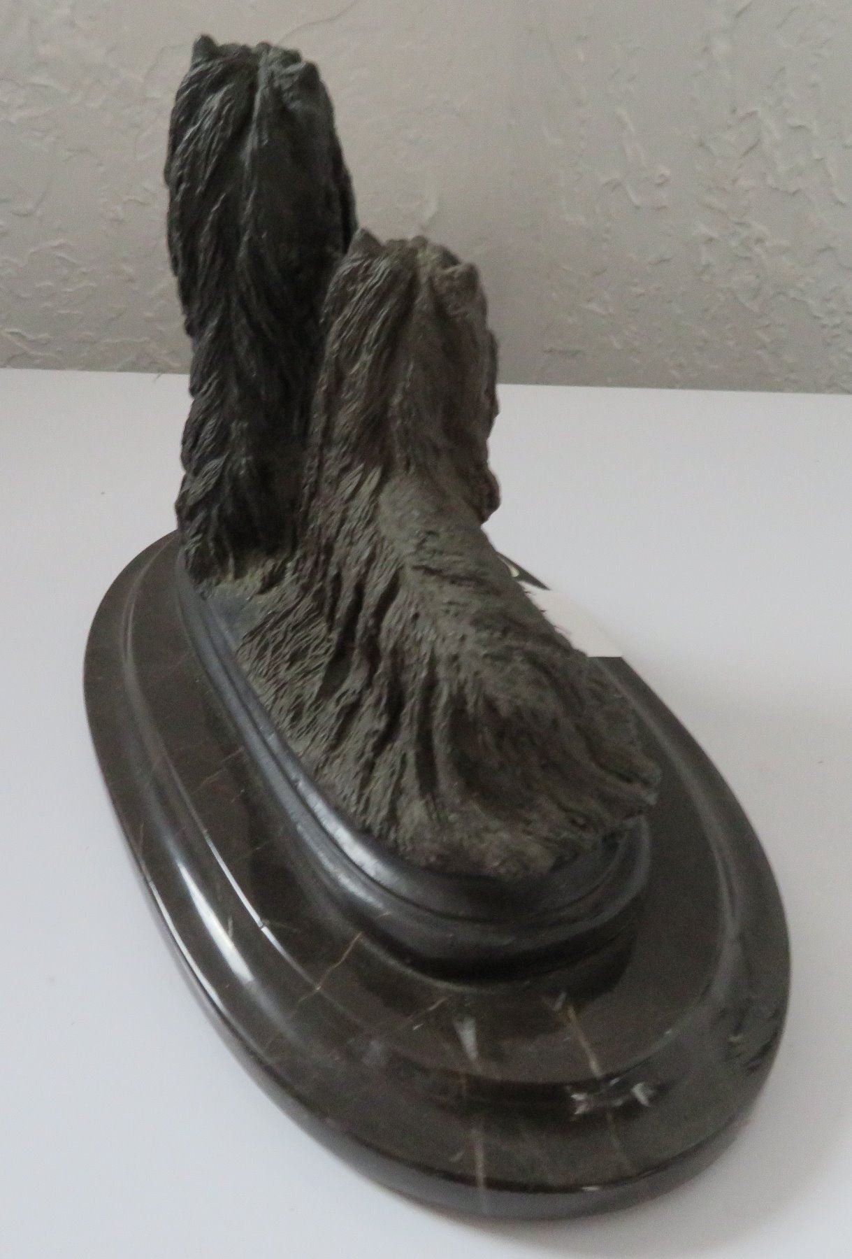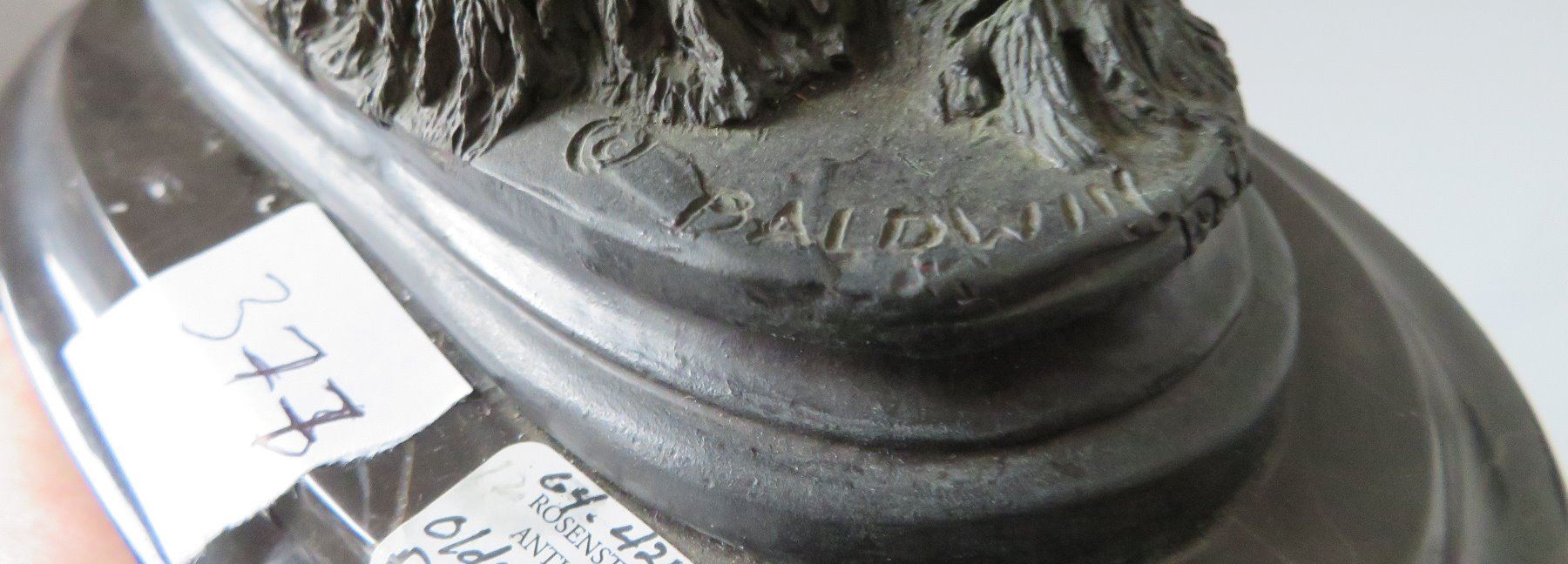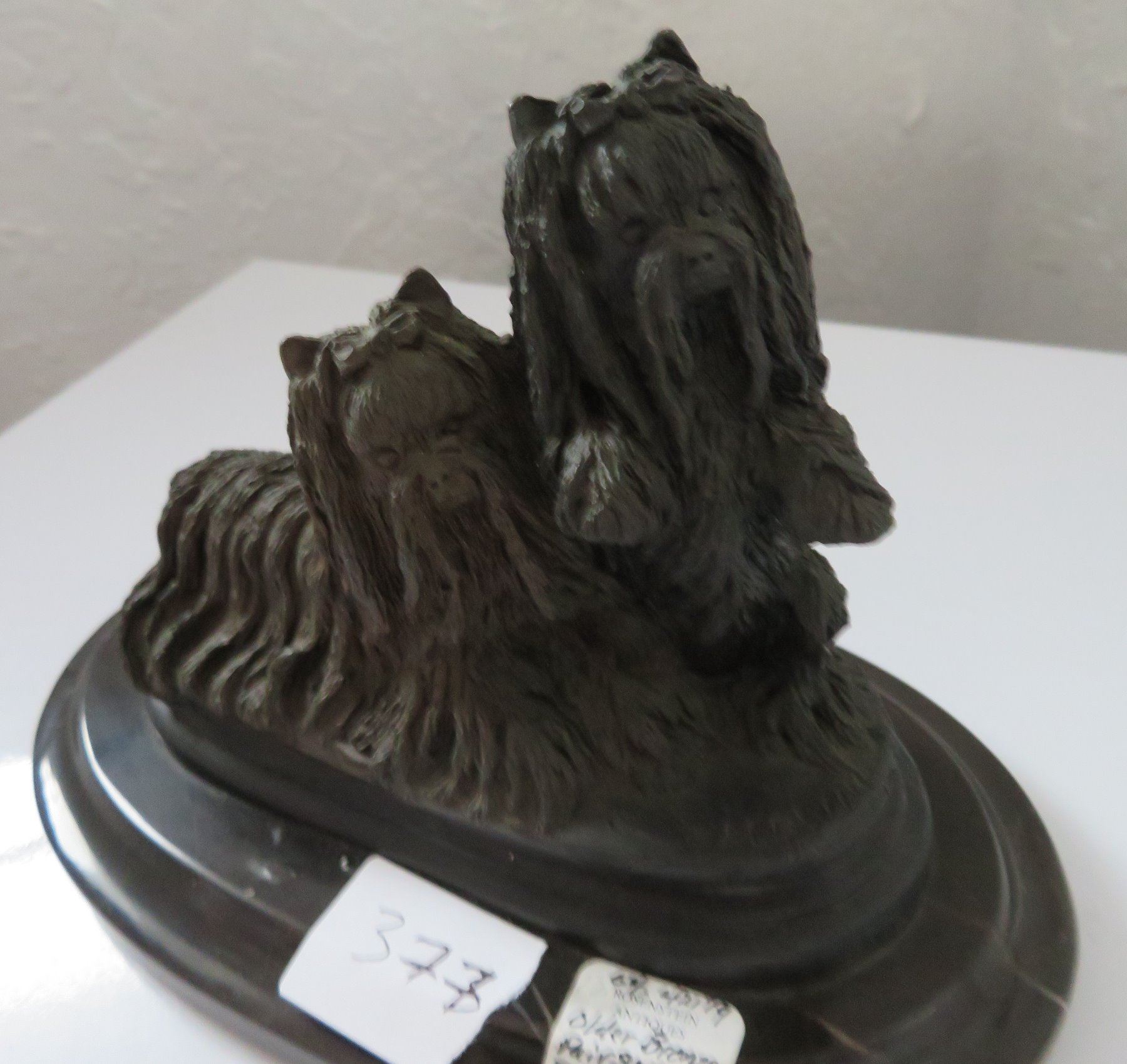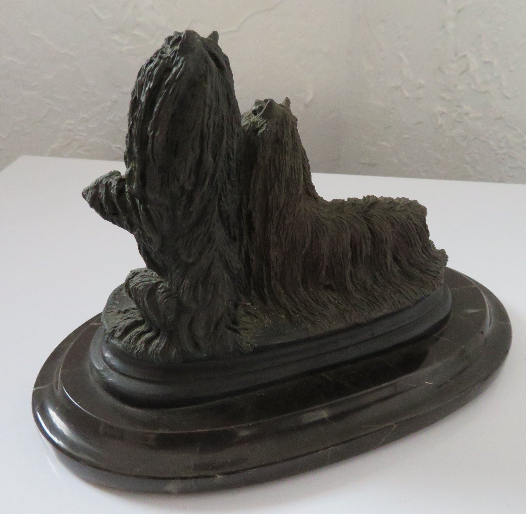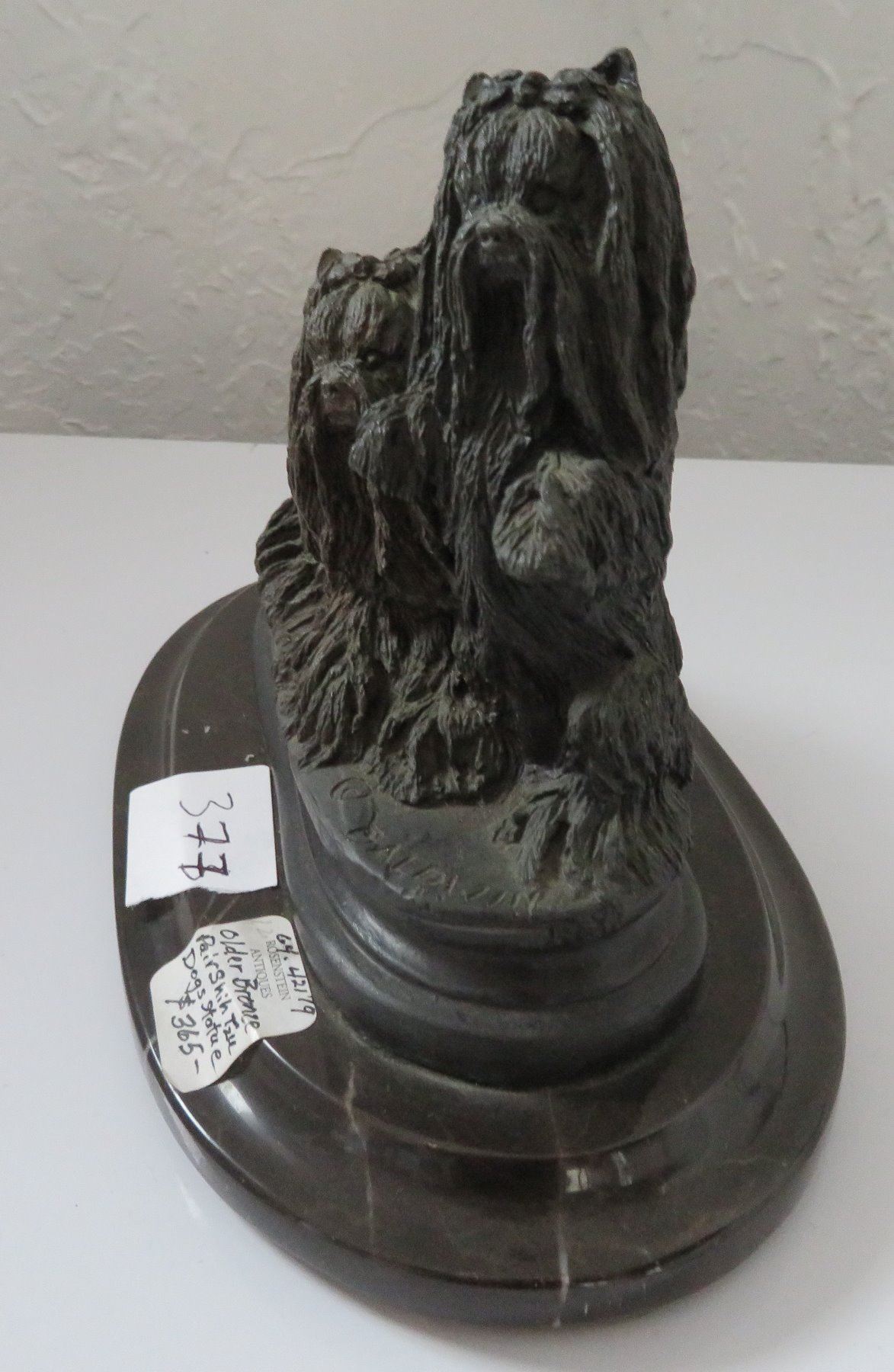 Bronze Yorkie Dog Sculptures on Base, antique item. Made of bronze, the item measures 8 1/2" x 4 1/2" x 5 1/2". Signed Baldwin. Item sits on a black marble base. Could be Scotties possibly or another Terrier. Condition: Good, patina, see images. Shipping: $28.50 w/insurance and signature, due to weight.