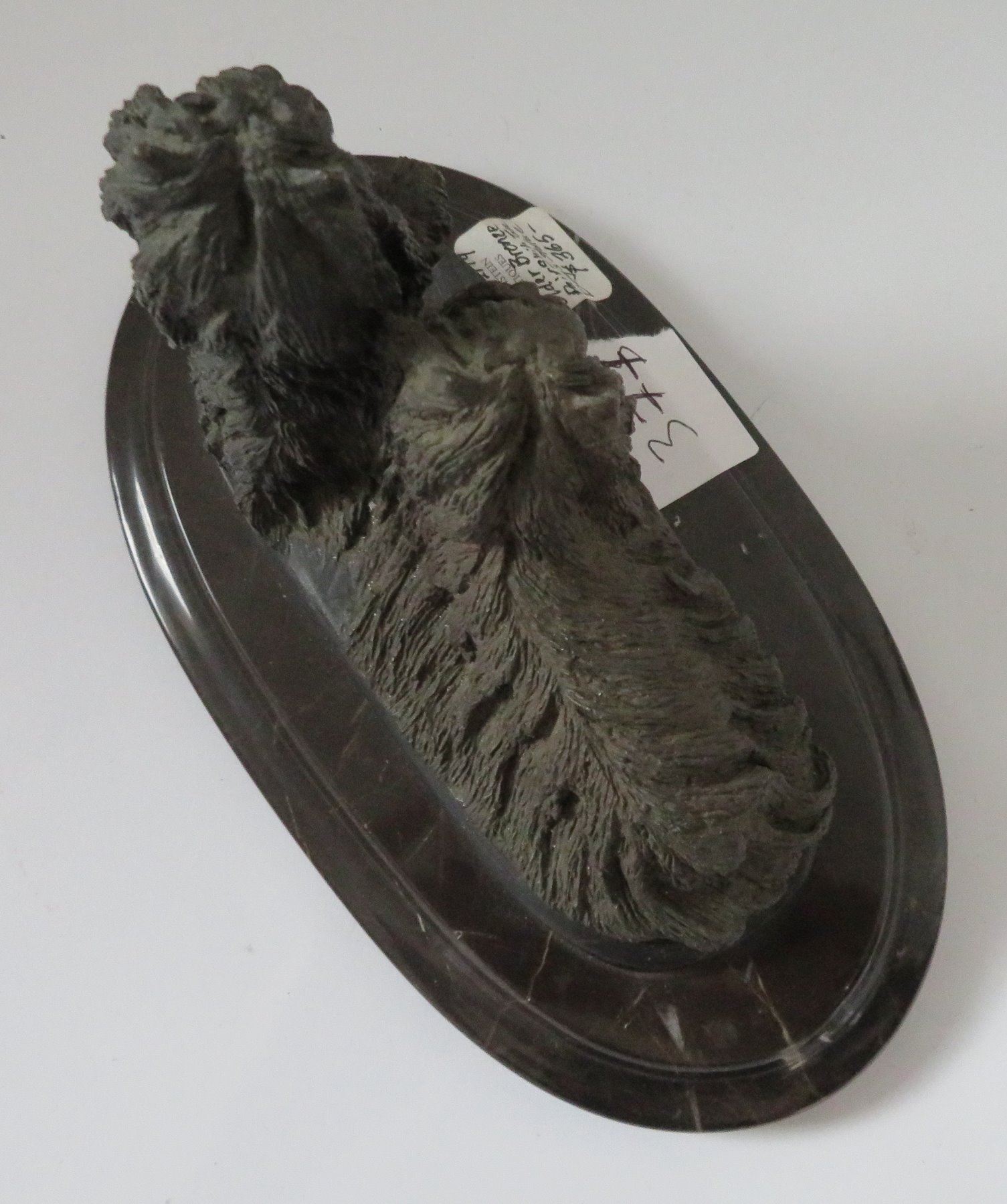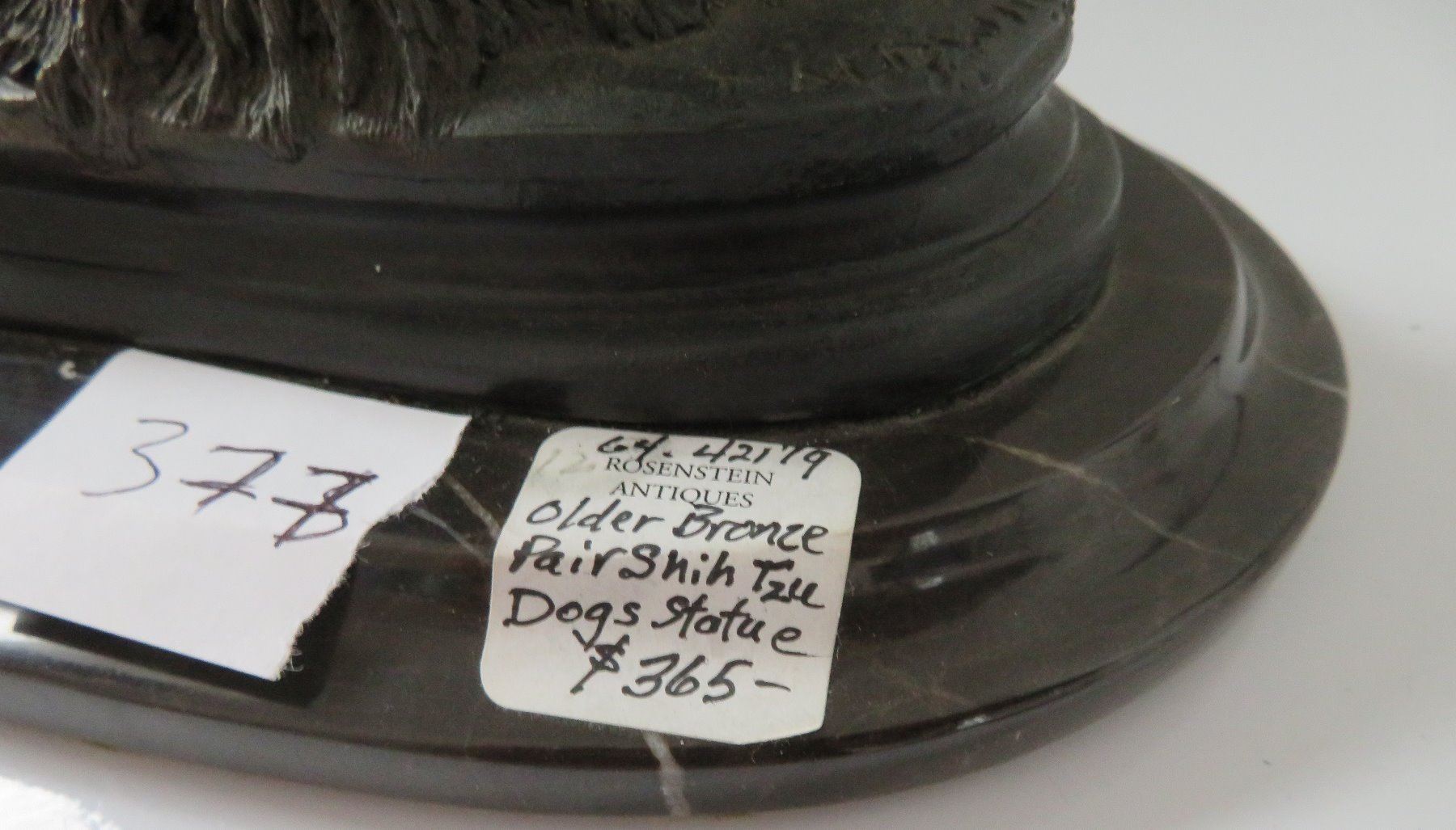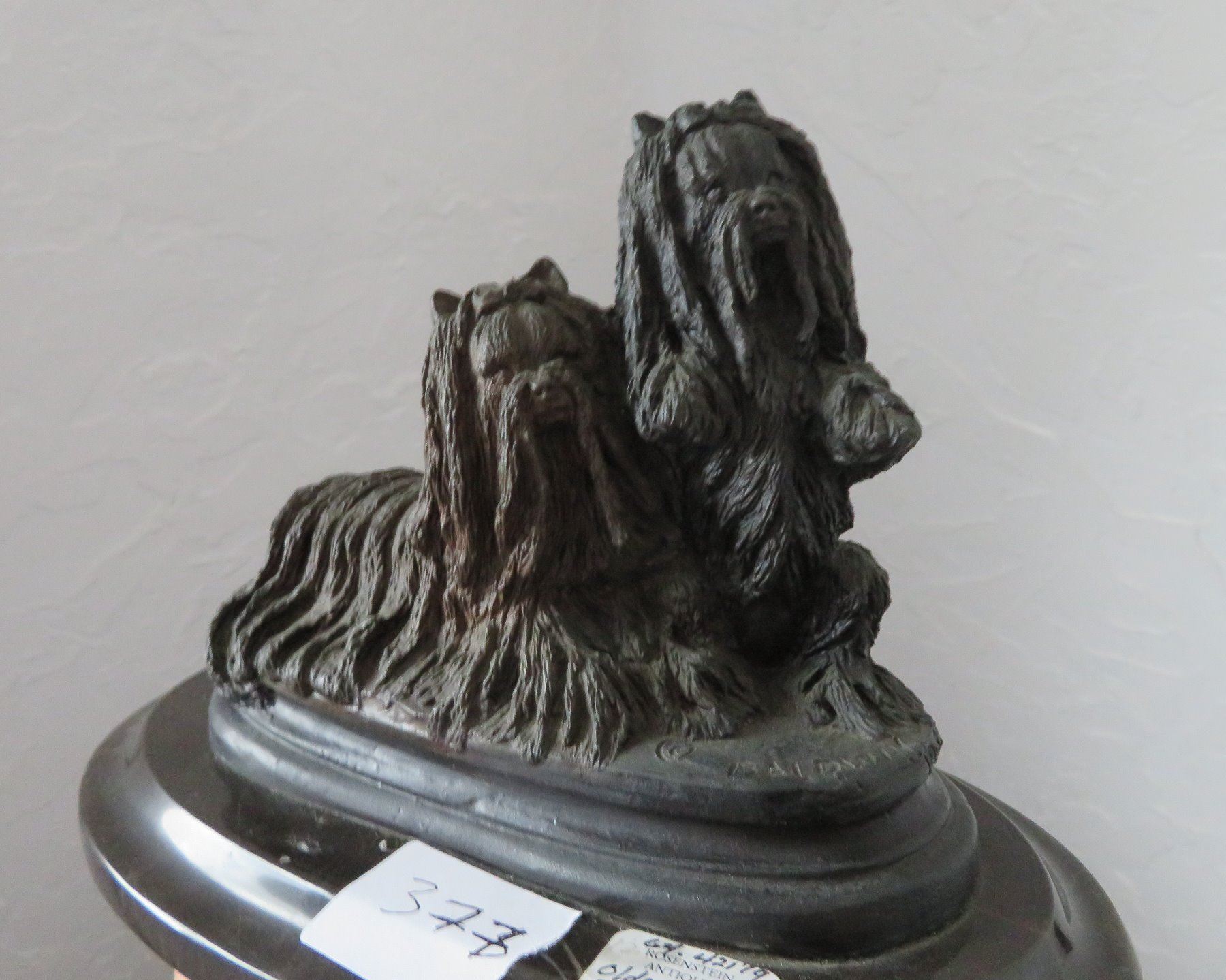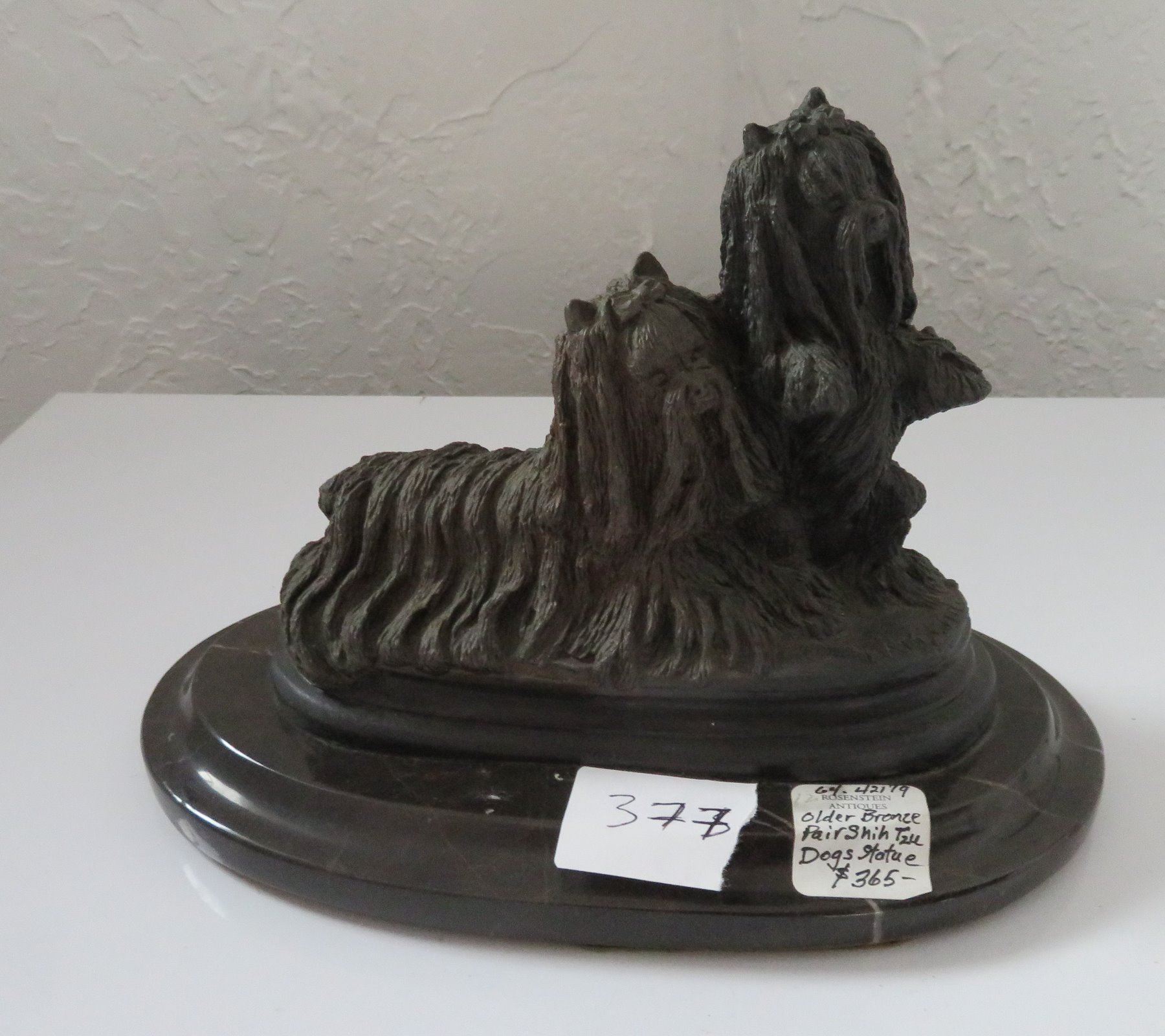 Bronze Yorkie Dog Sculptures on Base, antique item. Made of bronze, the item measures 8 1/2" x 4 1/2" x 5 1/2". Signed Baldwin. Item sits on a black marble base. Could be Scotties possibly or another Terrier. Condition: Good, patina, see images. Shipping: $28.50 w/insurance and signature, due to weight.