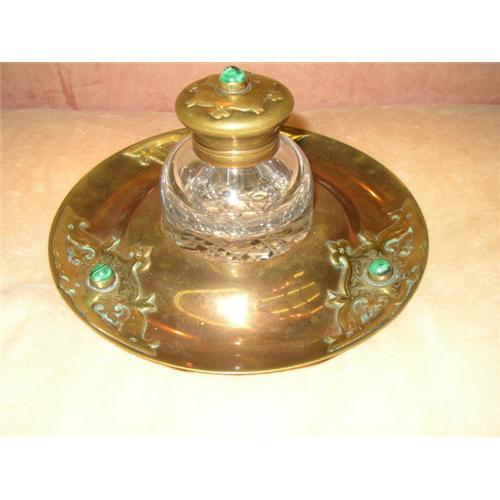 Jewelled Bronze Ink Stand with polished dome-shaped Crystal Ink Well, the bottom of which is finished in a hobnail cut crystal pattern. The piece is approximately 4 inches tall and 8 inches diameter. The well sits down in the stand approximately 1/3 inch. The lid of the Ink well is bronze with memory of the applied and engraved design which appears three times around the edge of the stand. These designs are topped with a cabouchon of polished deep, rich blue-green malachite, raw emerald or turquoise. There are no marks I can find on the piece to indicate time, maker or place of origin. The design has an Eastern feel. Could be Russian, Turkish, Persian but could also be English or American out of the Esthetic movement. The condition is good overall. There is one chip on the edge of the ink well at the bottom, and a tiny nick or two besides in the edges of the cuts. There is wear marking along the sides of the well where it comes in contact with the stand. None of this can be seen except when the well is out of the stand. The metal shows little wear, a few minor scratches that come with age and use.